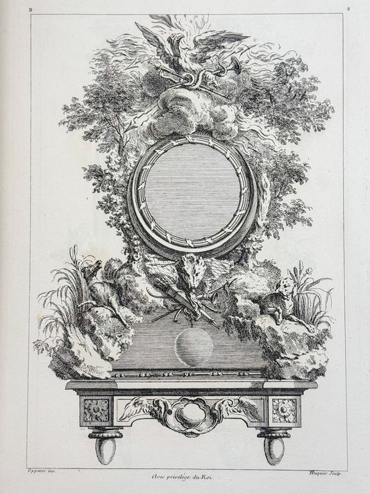 Œuvres de Gille Marie Oppenort. 2e Recueil. Frises, panneaux, pendules, pilastres, cartouches, feux, fontaines, gaines, profils de moulures, etc. gravé par Huquier.
