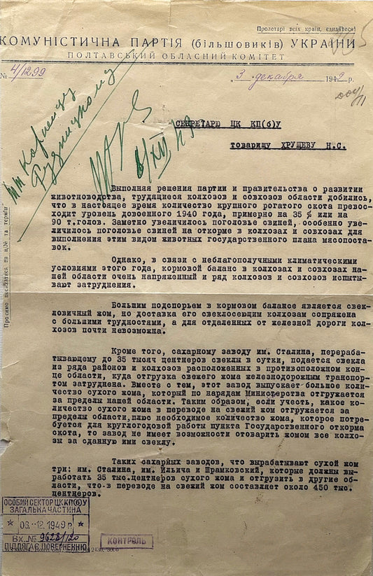 Document signed by Khrushchev, Communist Party of Ukraine to Nikita Khrushchev