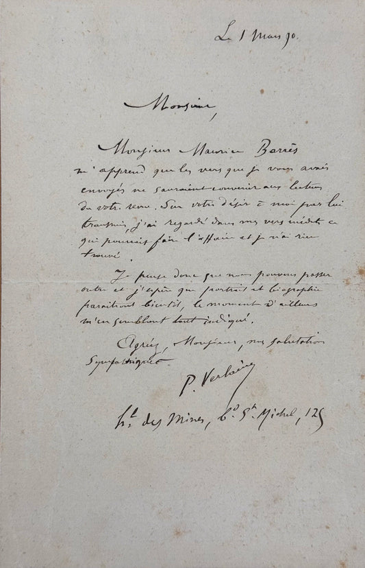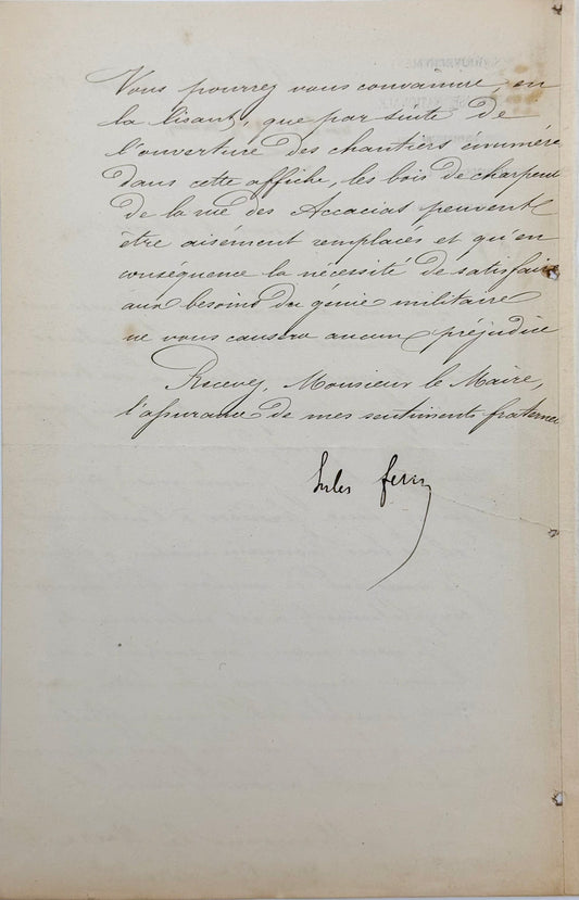 Autograph letter signed from Ferry to the Mayor of the 17th arrondissement of Paris