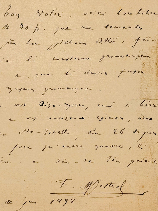 Autograph letter signed, Mistral to Valère [in Provençal]