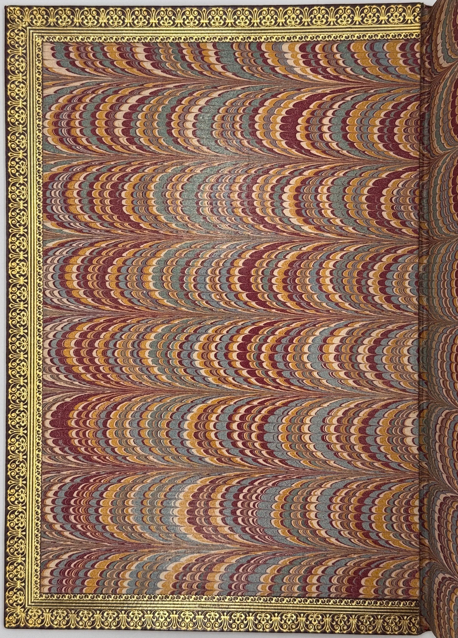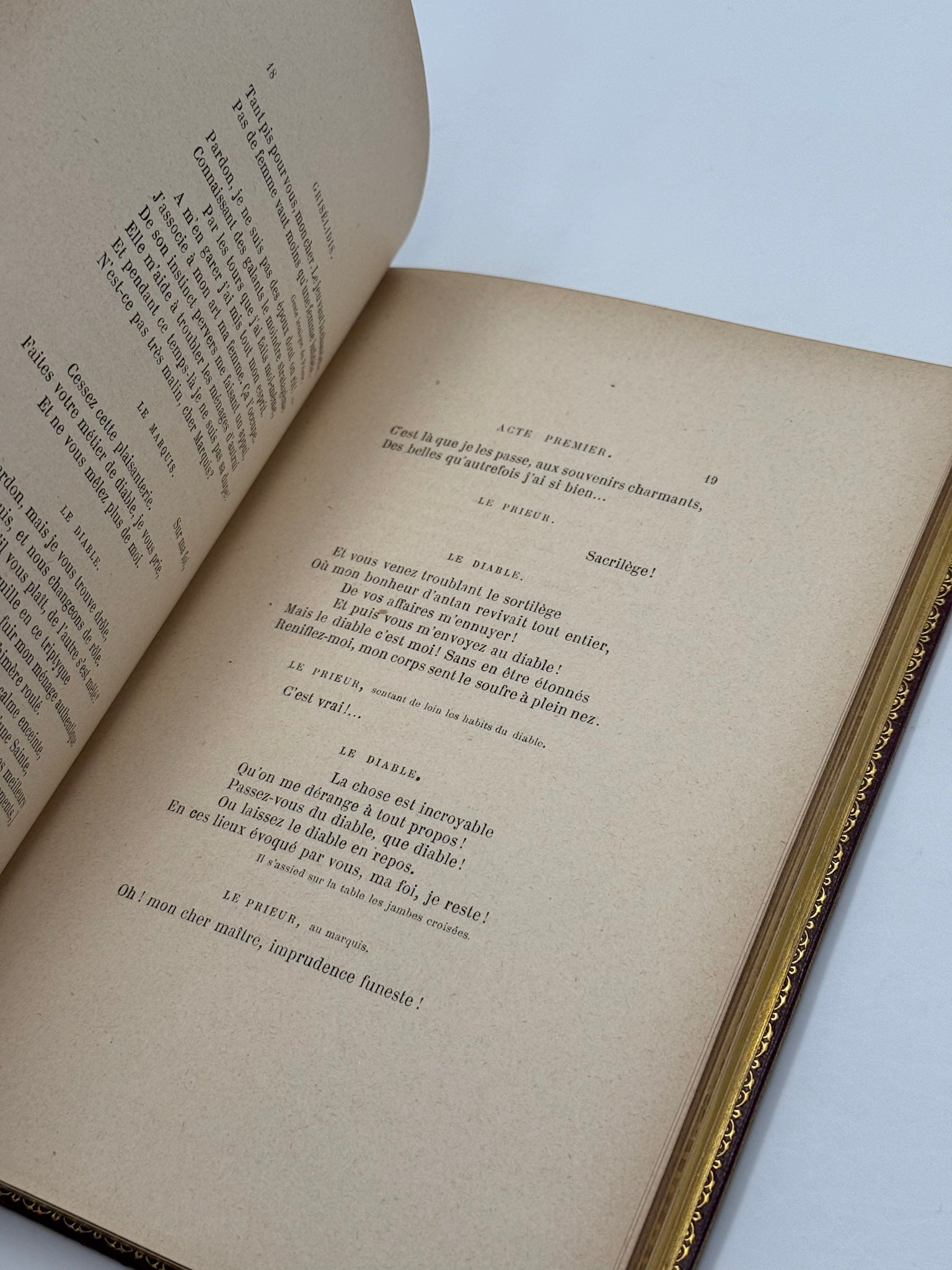 8vo (233 × 162 mm). (2) ff., VII, 99 pp., (6) ff. Full aubergine morocco, triple gilt fillet border, spine with raised bands richly gilt in double-panelled compartments with cornerpieces and central fleur-de-lys tool, gilt lettering, double gilt fillet to board edges, gilt edges, gilt turn-ins; original wrappers and backstrip preserved. Binding by Chambolle-Duru.
