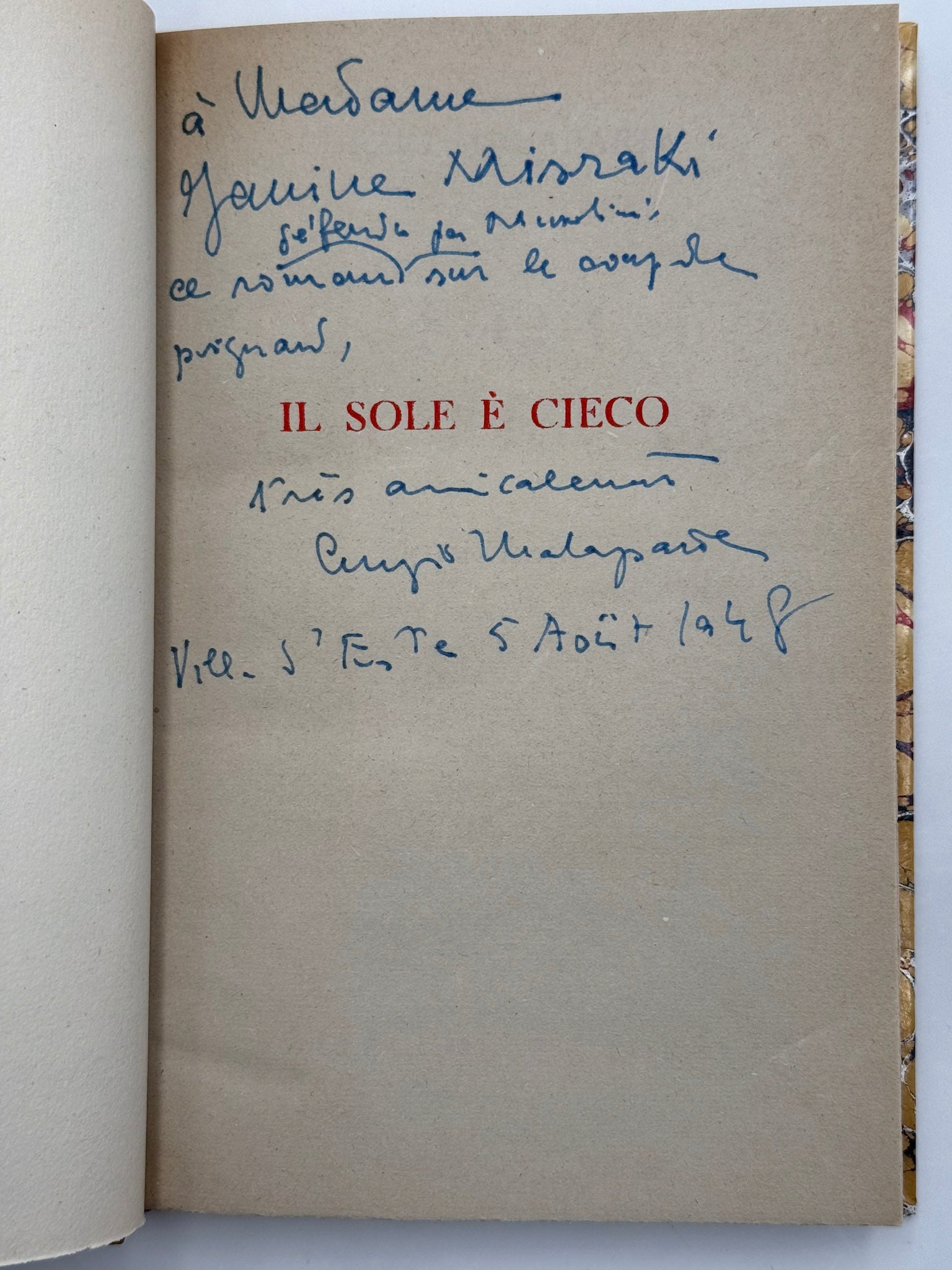 Superb inscription by Malaparte: "à Madame / Janine Misraki / ce roman défendu par Mussolini sur le coupable / [?], Il Sole è Cieco / très amicalement / Curzio Malaparte / Vill. St Este 5 Août 1948"