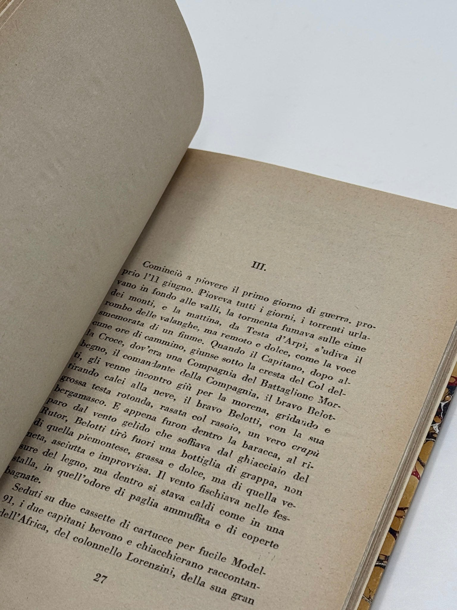An autobiographical narrative of the Alpine campaign, first published in serial form in Temps in January and February 1941, before appearing in book form in this scarce Vallecchi edition of 1947.