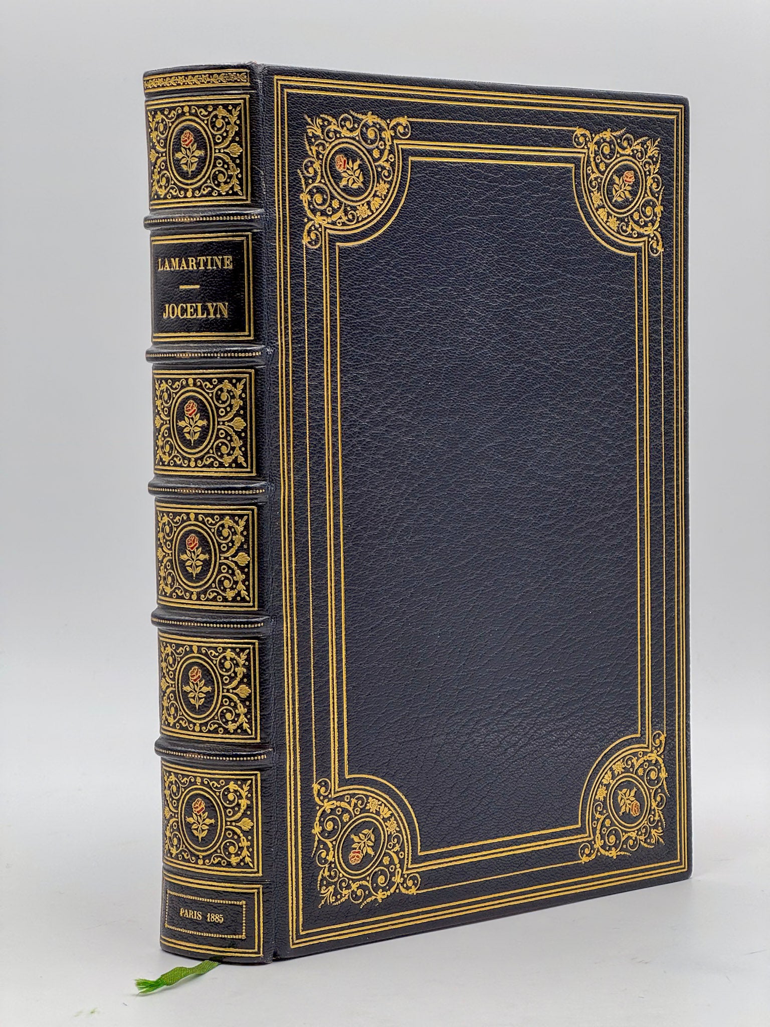 A magnificent production by Jouaust, pairing Lamartine’s major poetic text with a luxurious illustrative programme and one of the most elaborate modern bindings by Canape, whose use of mosaicked roses and embroidered tabis here is particularly striking.