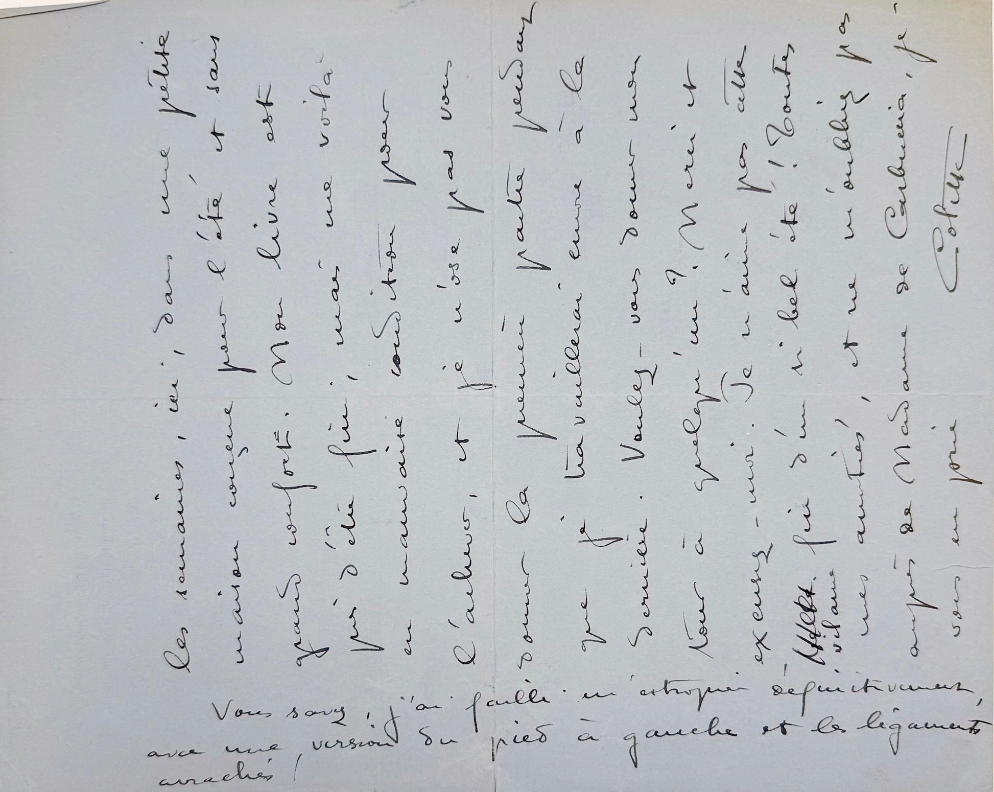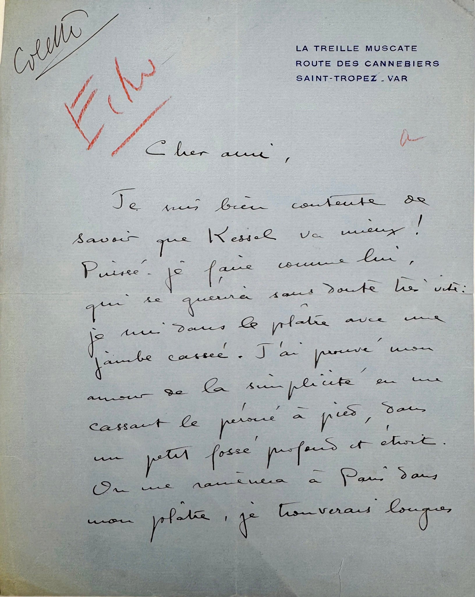 The accompanying autograph letter signed, longer and more intimate, describes a difficult convalescence following a fracture of the fibula. Colette recounts how she managed, “out of love for simplicity”, to injure herself merely by stepping into a narrow ditch. Immobilised in plaster, lodged uncomfortably in a small summer house lacking proper amenities, she asks that the delivery of the first part of her manuscript be postponed, as she is in no condition to finish the book. She adds with her characteristic mixture of humour and fatalism that she narrowly avoided a permanent injury, having torn several ligaments in the fall.