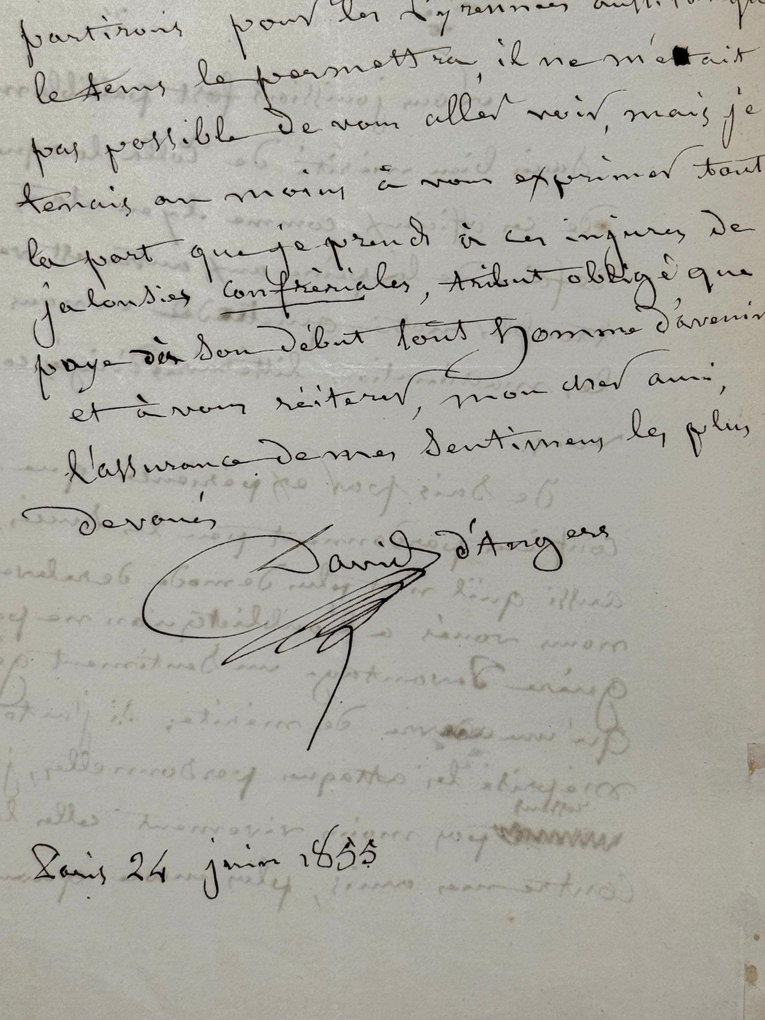 D’ANGERS, David (1788–1856). Autograph letter signed “David d’Angers” to Edmond About, Paris, 24 June 1855; with embossed letterhead.