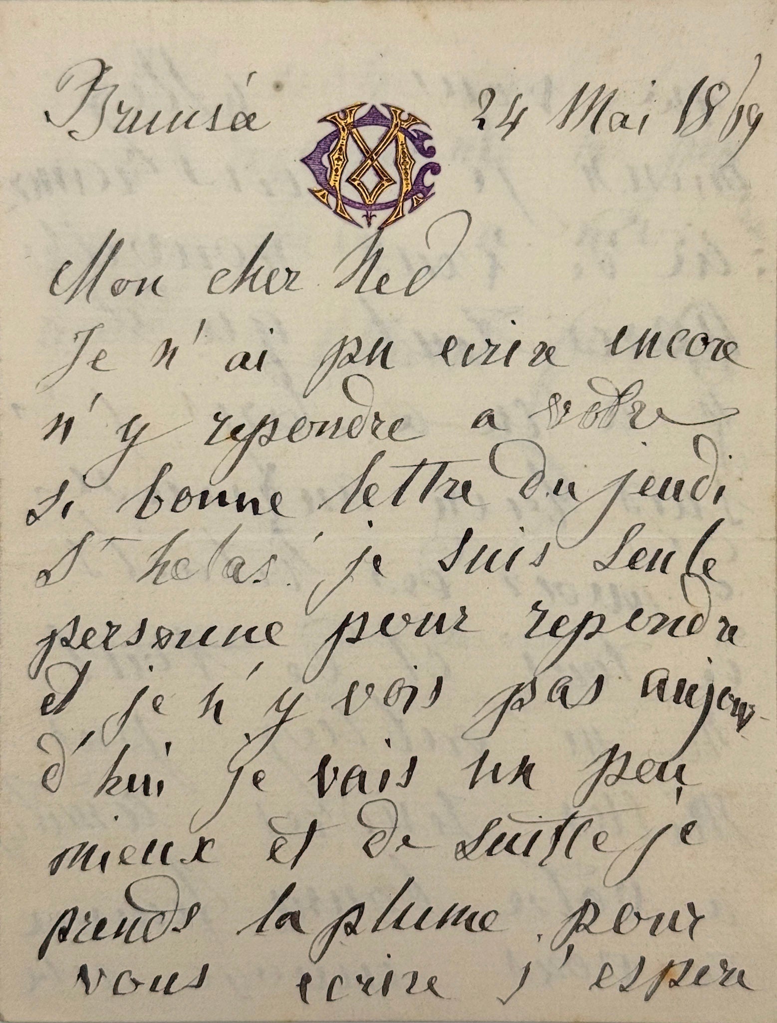 Writing from Switzerland, she apologises for her silence: “Je suis seule, personne pour répondre et je n’y vois pas aujourd’hui…” She notes that her sight has slightly improved, enabling her to take up the pen. Her concern for her correspondent’s health is immediate, followed by her own apprehension regarding events in Paris: “je suis bien anxieuse d’avoir des détails… de tous, et de tout.”