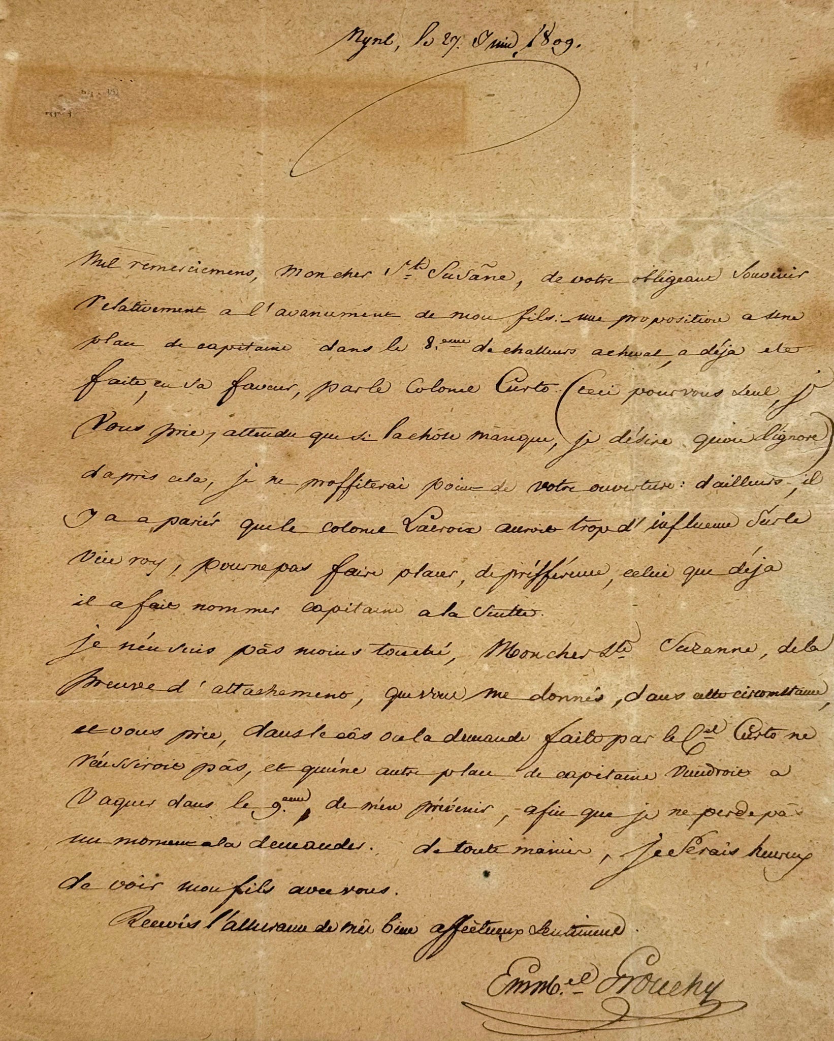 Grouchy nonetheless asks to be alerted immediately if another captain’s post should fall vacant in the 9th Chasseurs, insisting on his desire to see his son serving under Sainte-Suzanne. The tone is warm, personal and strategic — emblematic of the tightly interwoven networks of favour and patronage within the Napoleonic officer corps.