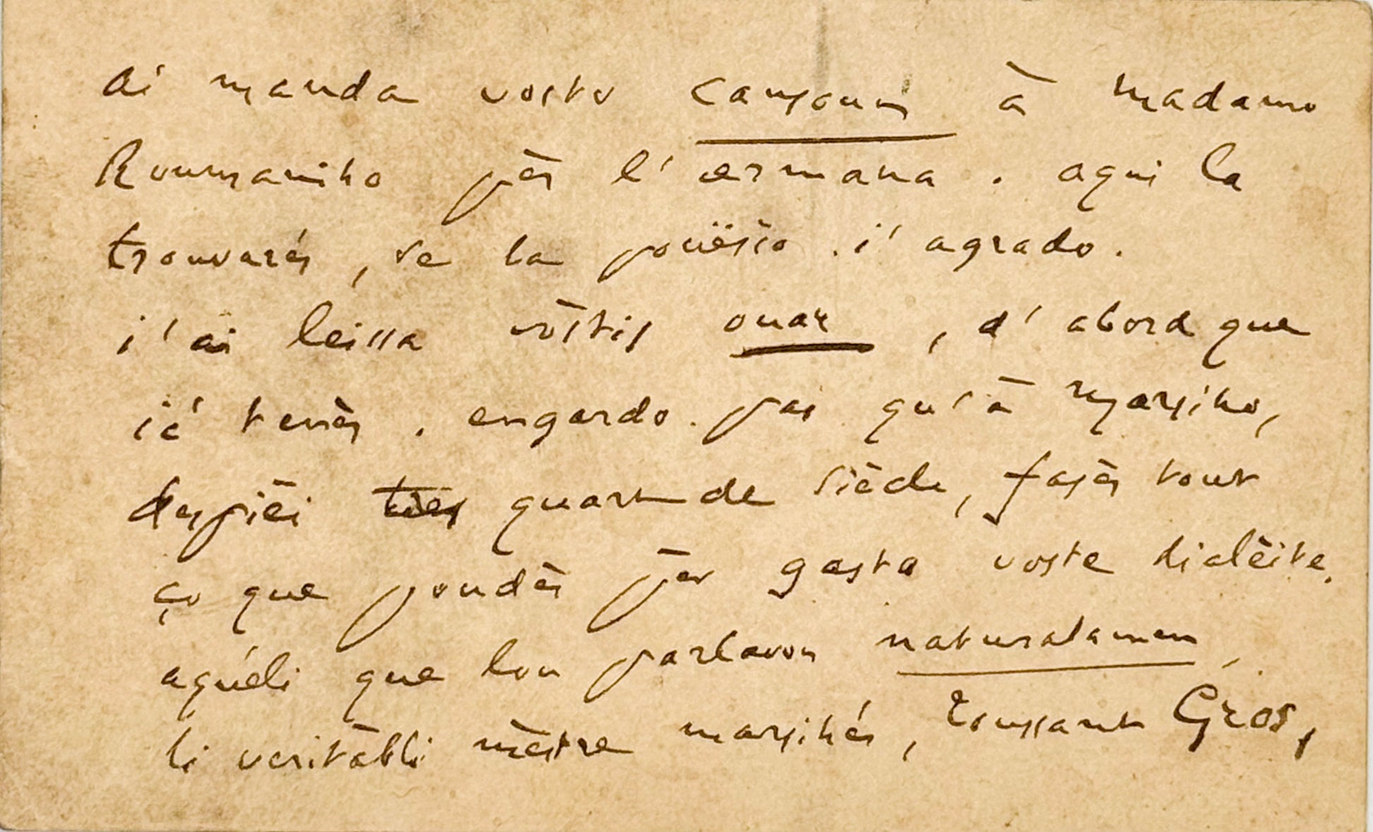 In the accompanying card, addressed to Madame Roumaniha, Mistral discusses orthography, praises a poem she has sent, and pays homage to the true masters of the eighteenth century such as Gros and Germain, who wrote Provençal “naturally”, without affectation. He notes humorously that others may write in a fashionable “gavouznado” style, adding “As for us, we keep to our Latin.”