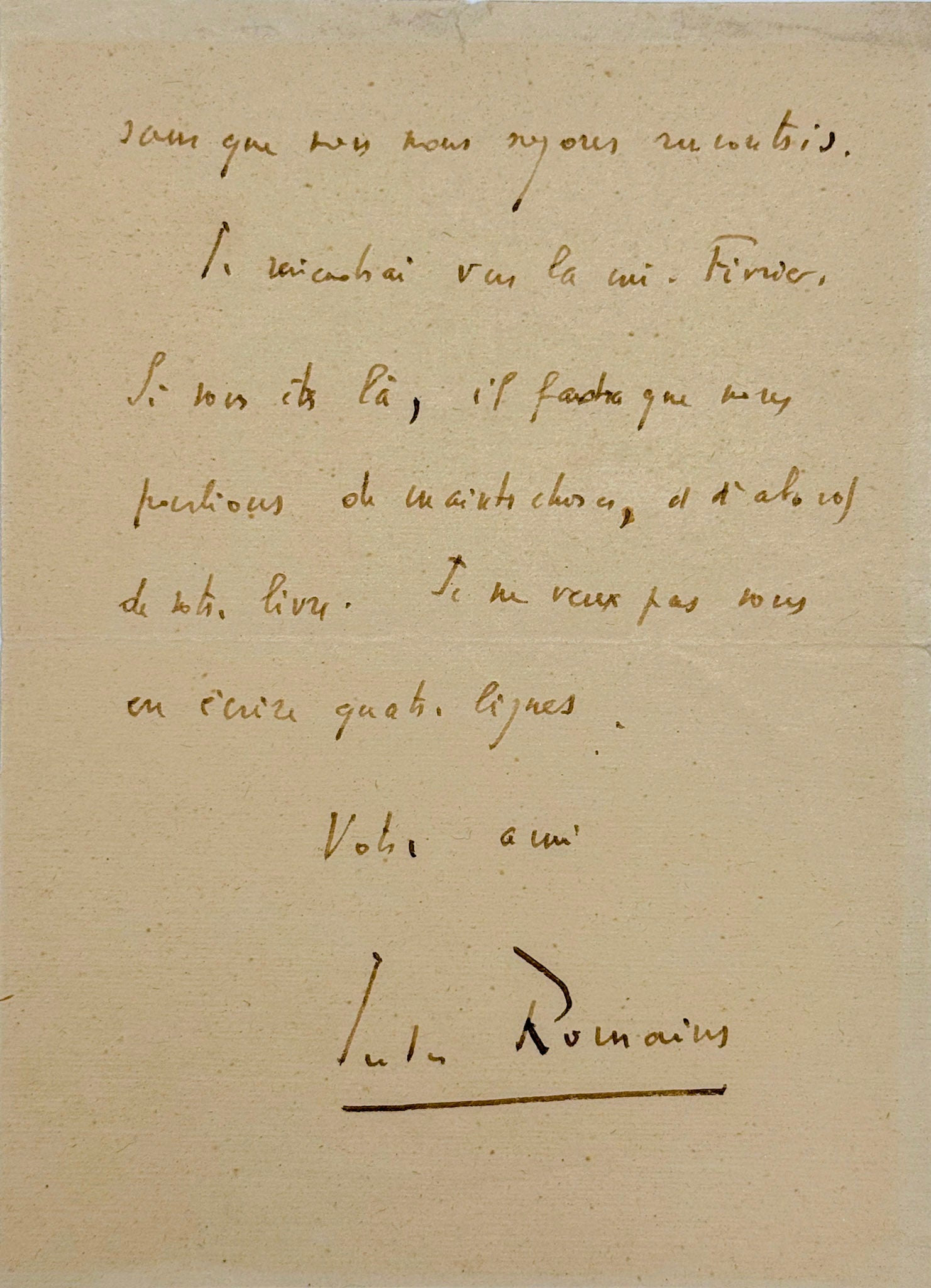 Romains notes that he is leaving Paris “the day after tomorrow” and will be away for some time, but expects to return in mid-February. He closes by expressing a sincere desire to resume their conversation upon his return, emphasising both his friendship and his interest in Courtois’s literary work.