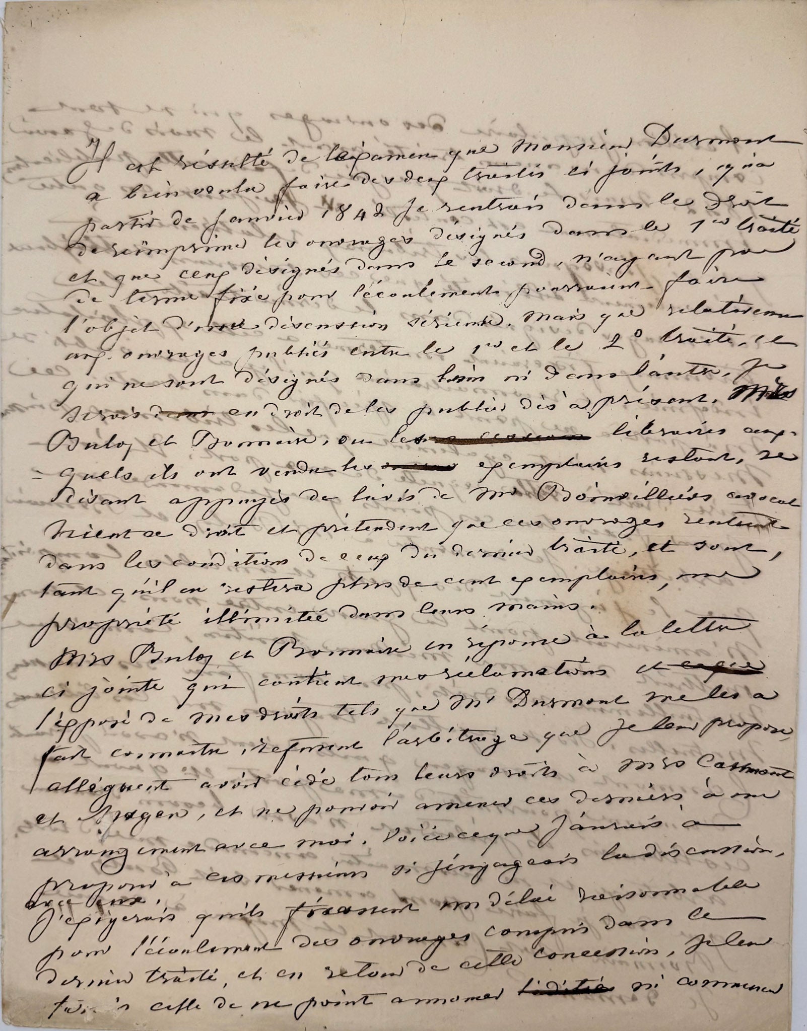 "Il est résulté de l'examen que monsieur Durmont a bien voulu faire des deux traités ci-joints, qu'à partir de janvier 1842 je rentrais dans le droit de réimprimer les ouvrages désignés dans le 1er traité et que ceux désignés dans le second, n'ayant pas de terme fixé pour l'écoulement pourraient faire l'objet d'une discussion sérieuse. Mais que relativement aux ouvrages publiés entre le 1er et le 2° traité, ceux qui ne sont désignés dans l'un ni dans l'autre, je serais en droit de les publier dès à présent. Mrs Buloz et Bonnaire, ou les librairies auxquels is ont vendu les exemplaires restants, se faisant appuyés de suivis de Mrs Boinvilliers avocat, disen se [?] et prétendent que ces ouvrage rentrent dans les conditions de ceux du dernier traité, et sont, tant qu'il en restera plus de cent exemplaires, une propriété illimitée dans leurs mains.
