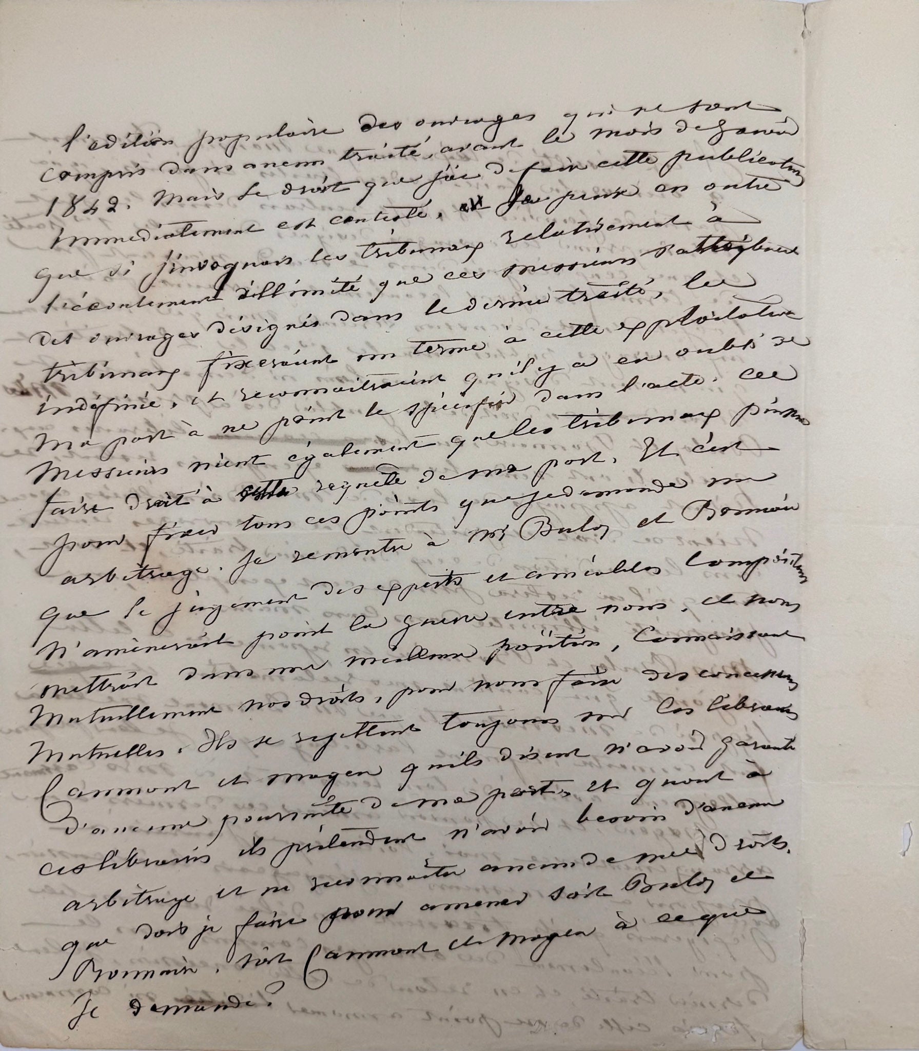 J'exigerais qu'ils fixent un délai raisonnable pour l'écoulement des ouvrages compris dans le dernier traité, et en retour de cette concession, je leur ferais celle de ne point amener ni commencer l'édition populaire des ouvrages qui ne sont compris dans aucun traité, vant le mois de janvier 1842. Mais le droit que j'ai de faire cette publication immédiatement est contesté. J'exigerais en outre que si j'invoquais les tribunaux relativement à l'écoulement illimité que ces messieurs [?] des ouvrages désignés dans le dernier traité, les tribunaux fixeraient un terme à cette exploitation indéfinie et reconnaîtraient qu'il y a eu oubli de ma part à ne pont le specifié dans l'acte. Ces messieurs nient également que les tribunaux puissent faire [?] à cette [?] de ma part. Et c'est pour fixer tous ces points que je demande un arbitrage. Je démontre à Mrs Buloz et Bonnaire que le jugement des esprits et amicales compositions n'amèneront point la guerre entre nous. Il nous mettrait dans une meilleure position, connaissant mutuellement nos droits, pour nous faire des concessions mutuelles. Ils se rejettent toujours sur les libraires Comon et Magen qu'ils disent n'avoir garantie d'aucune poursuite de ma part. Et quant à ces libraires ils prétendent n'avoir besoin d'amener arbitrage et ne reconnaissent aucun de mes droits. Que dois-je faire pour amener soit Buloz et Bonnaire, soit Comon et Magen à ce que je demande ?"