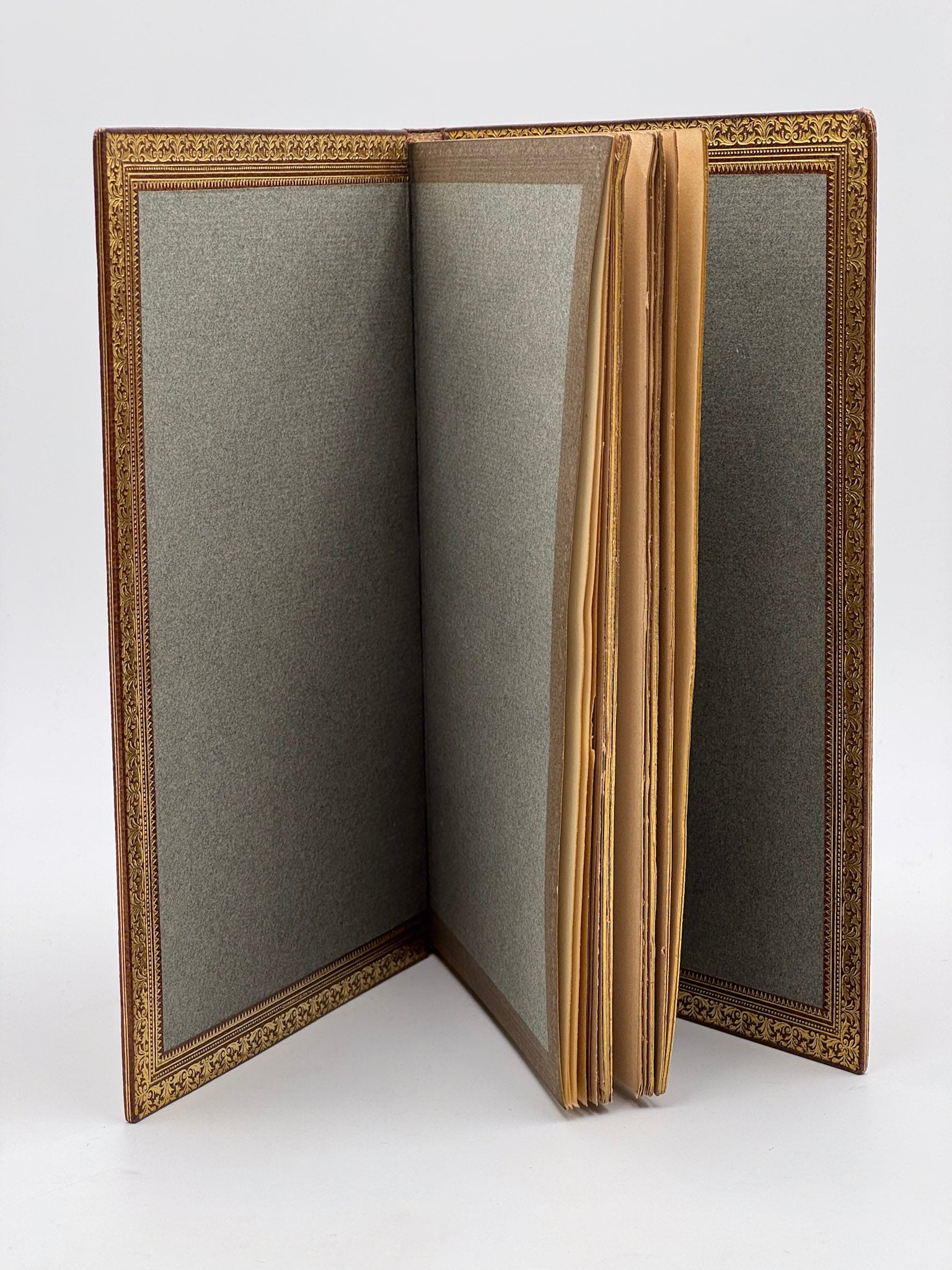 8vo (189 × 132 mm). (4) ff., 89 pp., (1) f. Full chocolate morocco, triple gilt fillet border to covers, spine with raised bands richly gilt in double-panelled compartments with cornerpieces and central flower tool, gilt lettering, double gilt fillet to board edges, gilt edges, gilt turn-ins; original wrappers and backstrip preserved. Binding by Chambolle-Duru.