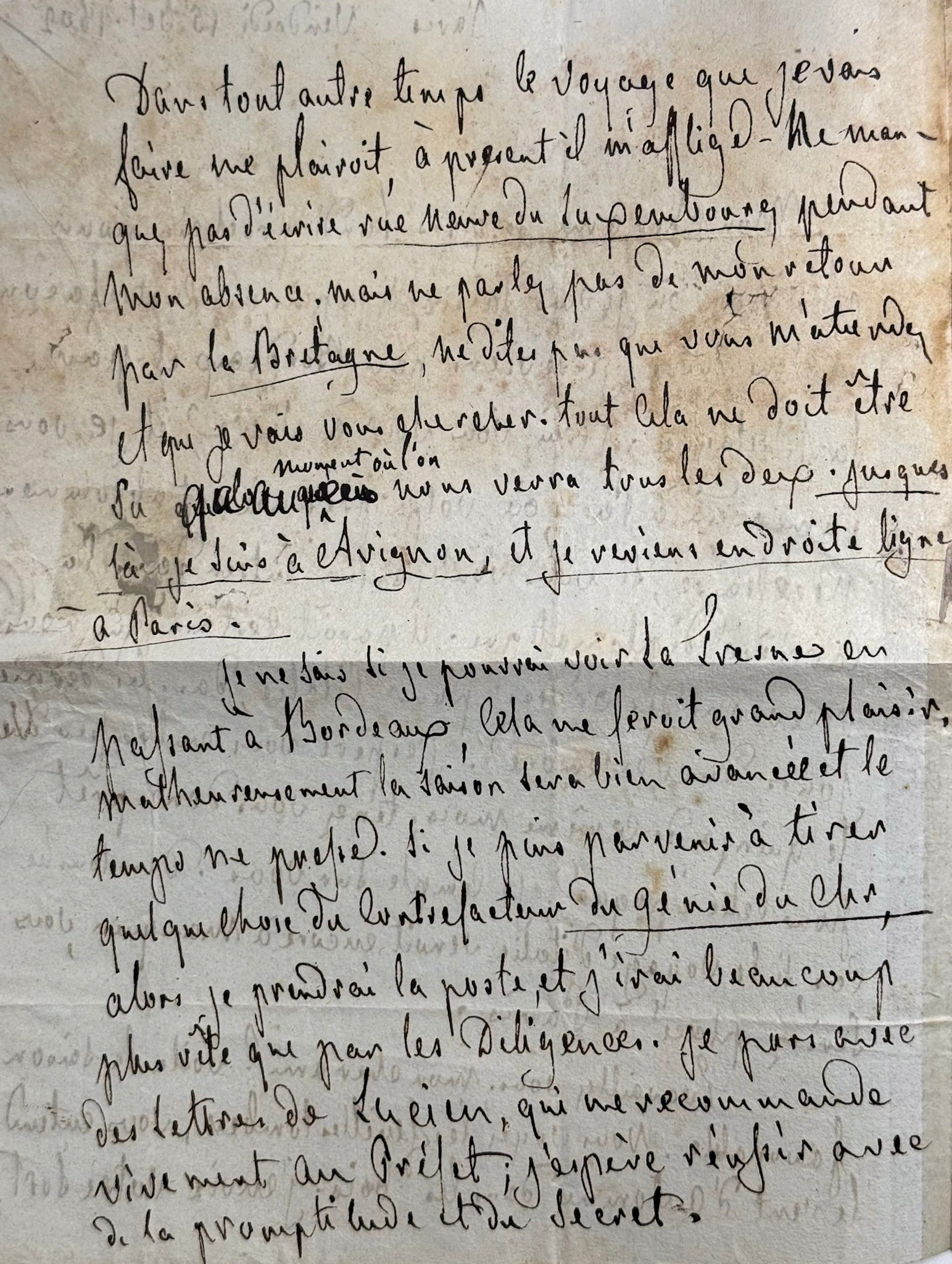 Cette lettre intime éclaire de manière saisissante la vie de l’auteur au moment où son Génie du christianisme connaît un succès retentissant. Chateaubriand y évoque un voyage imminent à Avignon pour tenter de faire saisir une contrefaçon du Génie du christianisme, ses projets de retour par la Bretagne, et surtout la préparation d’un poste diplomatique en Italie – fonction qu’il exercera effectivement peu après, comme attaché à la légation près du Saint-Siège. Il y presse son ami de le rejoindre à Paris, dans une prose traversée d’images automnales et d’une mélancolie romantique : « Vous voyez les feuilles tomber, vous entendez le vent d’automne dans les bois – j’envie votre sort... »