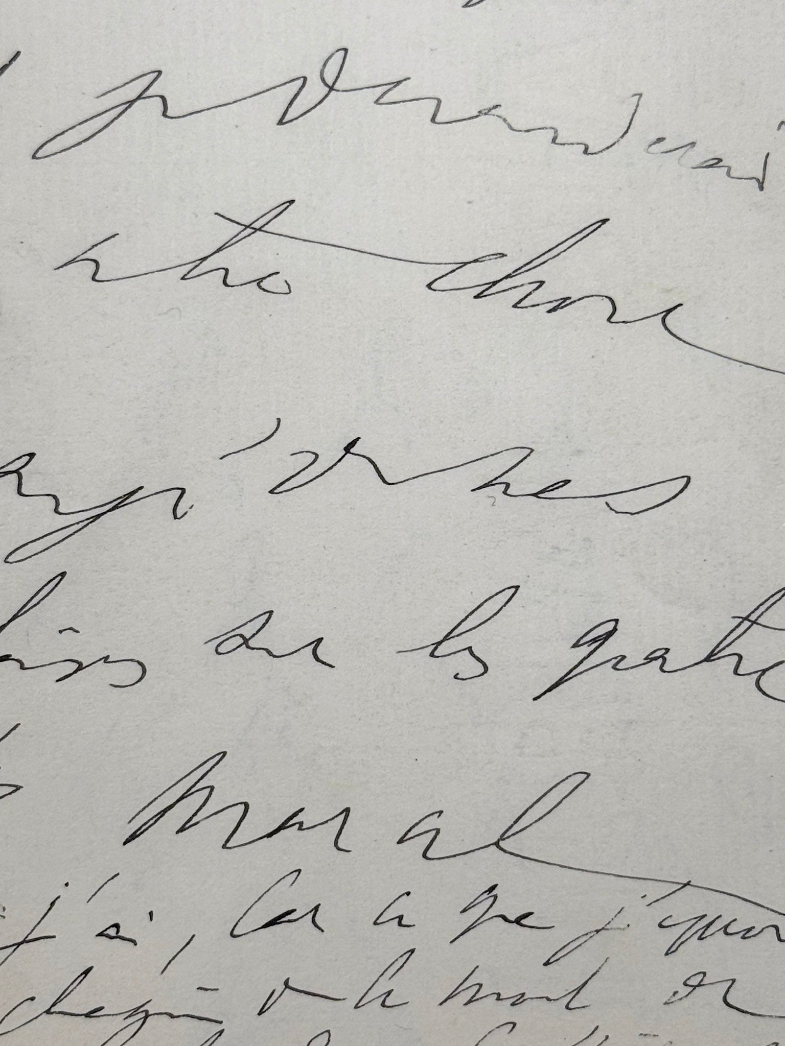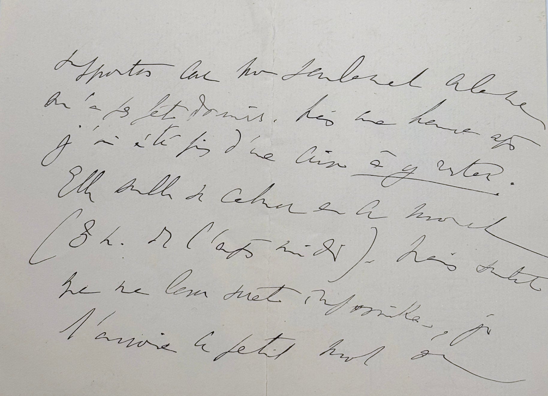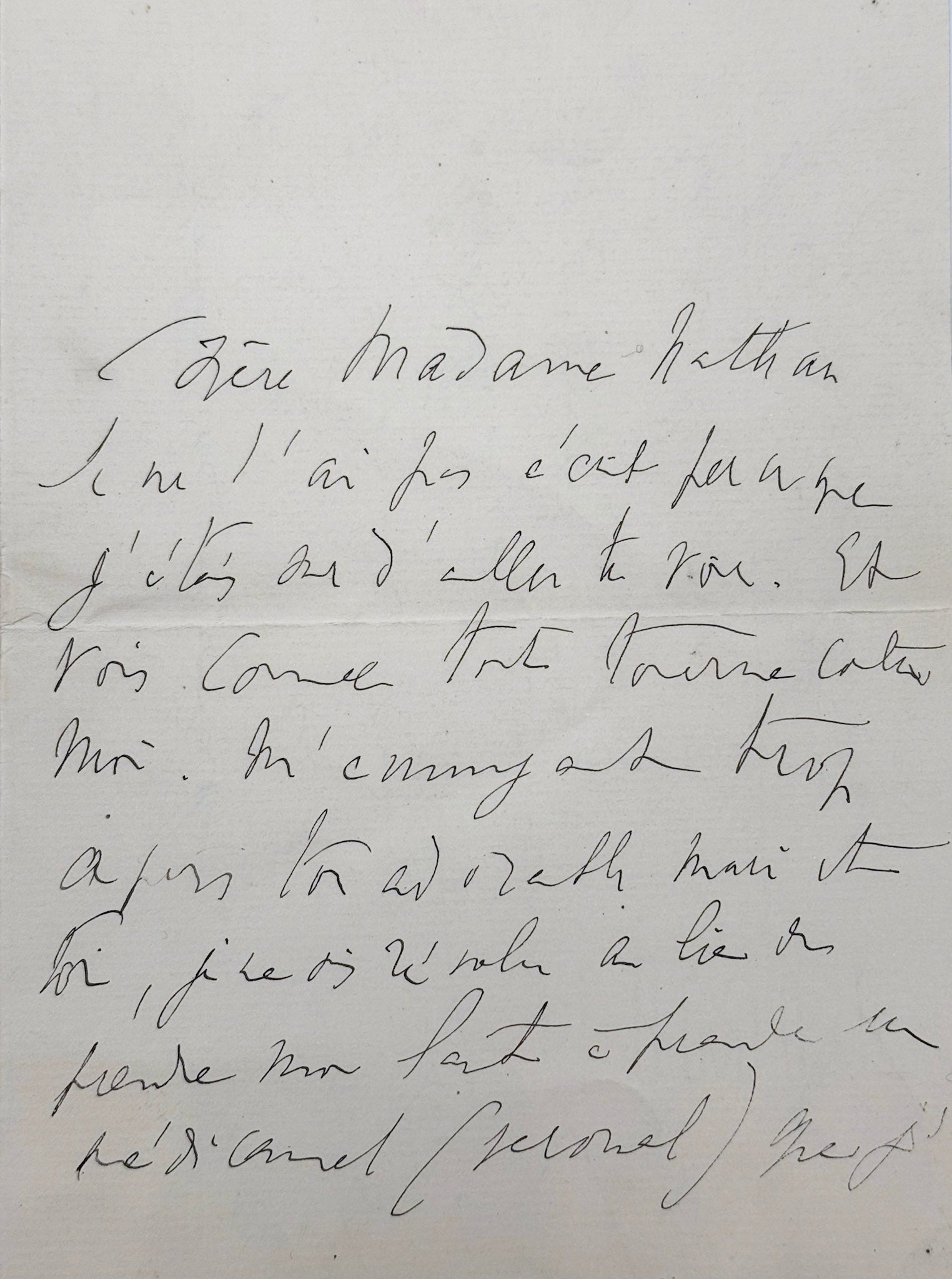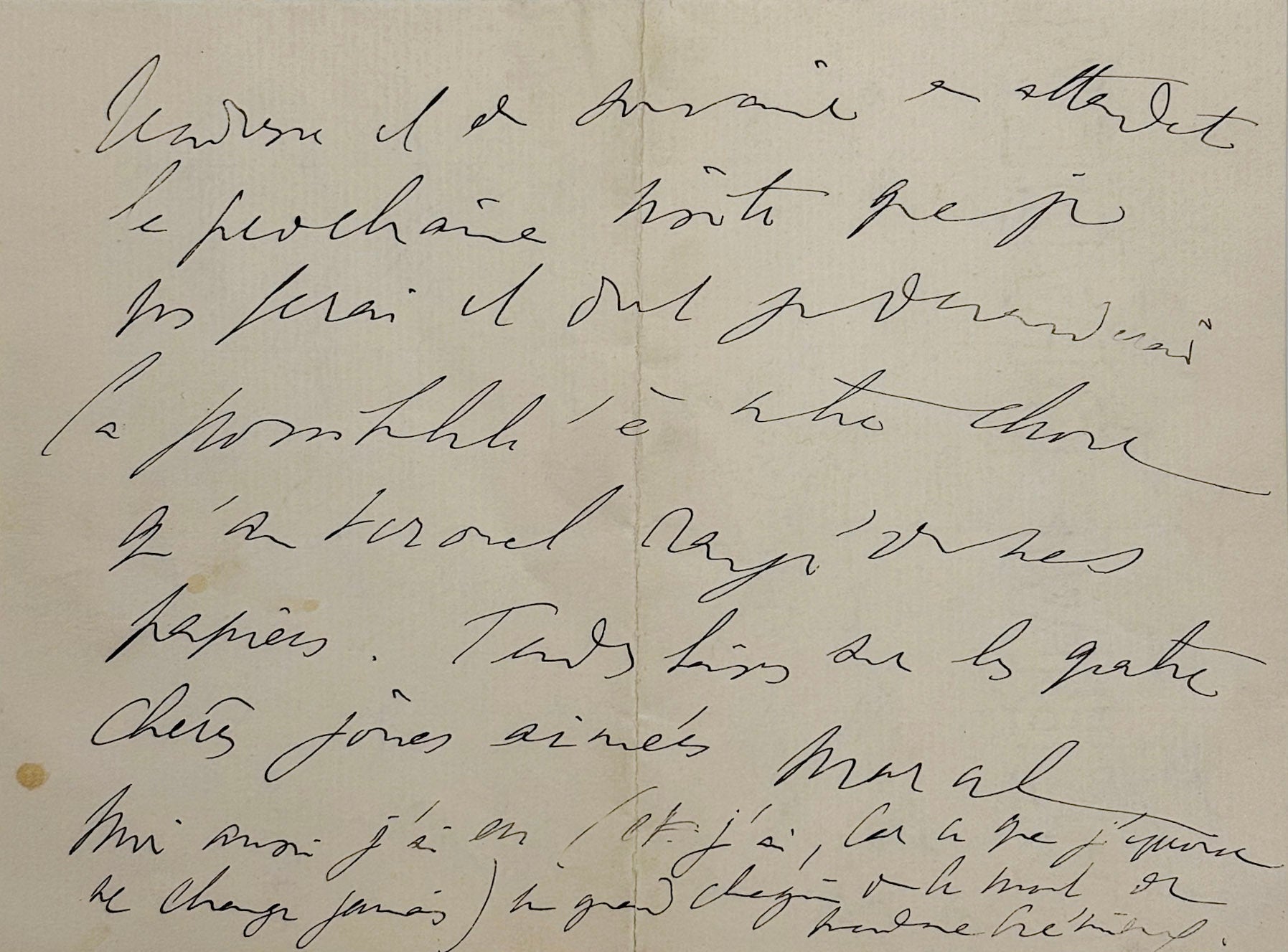 “Je ne t’ai pas écrit parce que j’étais sûr d’aller te voir. Et vois comme tout tourne contre moi. M'ennuyant trop après ton adorable mari et toi, je me suis résolu au lieu de prendre mon lait à prendre un médicament (véronal) que j'ignorais et qui m'avait-on dit me ferait dormir et me mettrait en état d'aller l'après-midi voir les personnes que je désirais tant voir. Or on est allé l'acheter hier soir à minuit. Je l'ai pris aussitôt. Mes reins ne peuvent plus sans doute rien supporter car non seulement cela ne m'a pas fait dormir mais une heure après j'ai été pris d'une crise à y rester. Elle semble se calmer en ce moment (trois heures de l'après-midi) Mais sentant que me lever serait impossible, je t'envoie ce petit mot de tendresse et de souvenir en attendant la prochaine visite que je vous ferai et dont je demanderai la possibilité à autre chose qu'au véronal rayé de mes papiers. Tendres baisers sur les quatre chères joues aimées”... Il ajoute qu'il a eu “un grand chagrin de la mort de Madame Crémieux.”