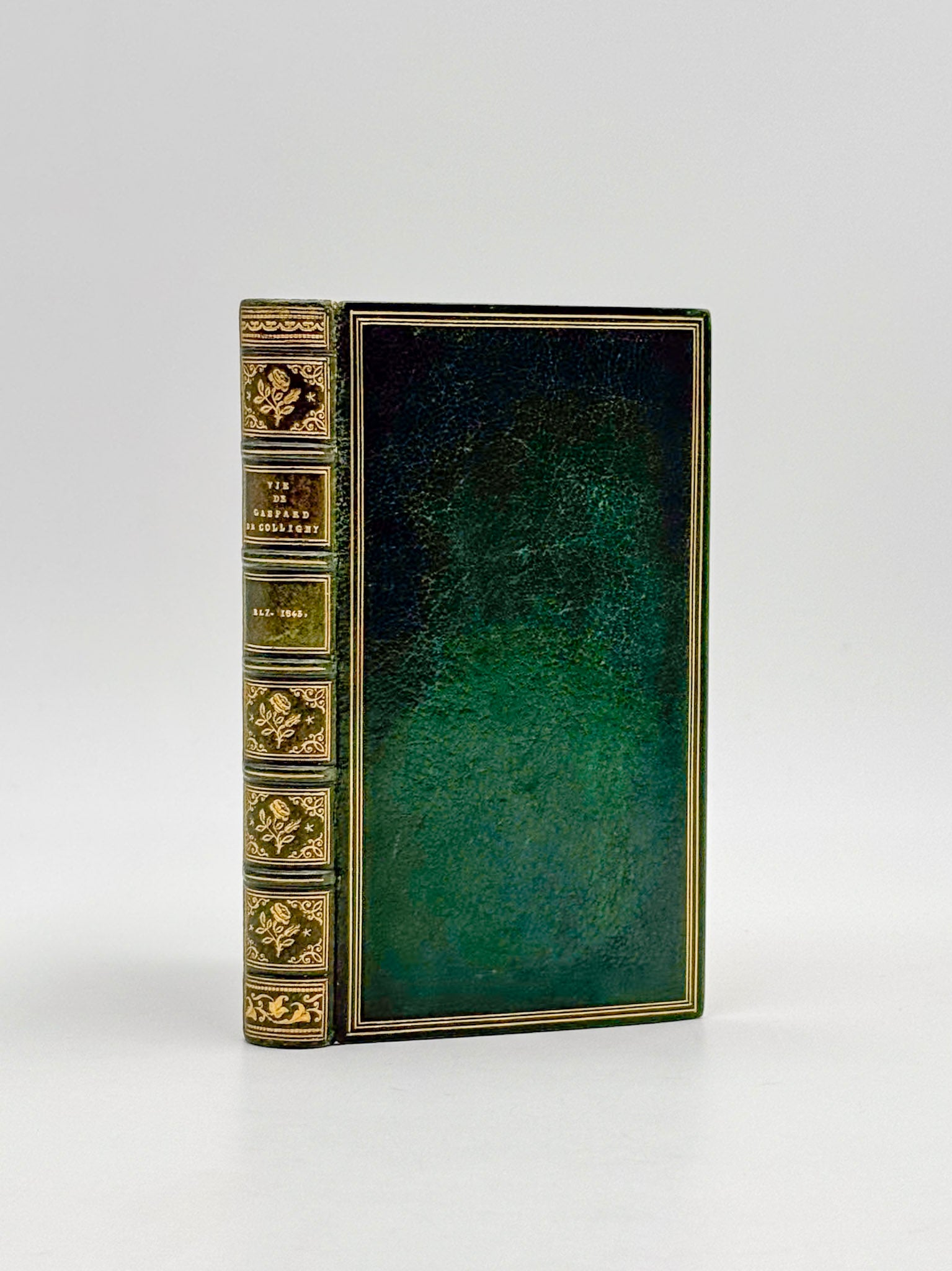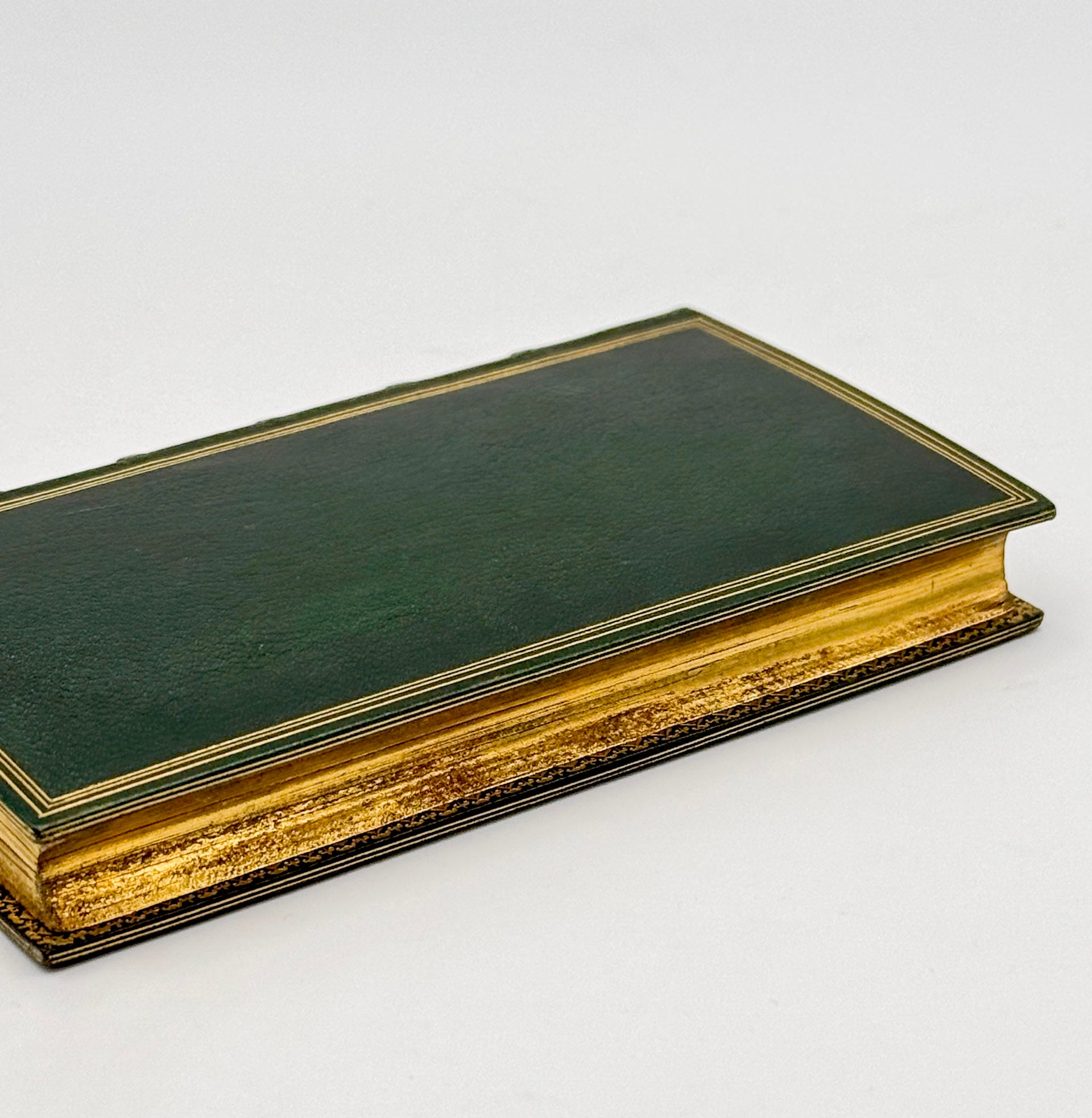 Plein maroquin vert impérial, triple filet d'encadrement des plats, dos à nerfs fileté, riche décors aux caissons, double filet sur les coupes, tranches dorées, roulette intérieure (M. Niédrée).