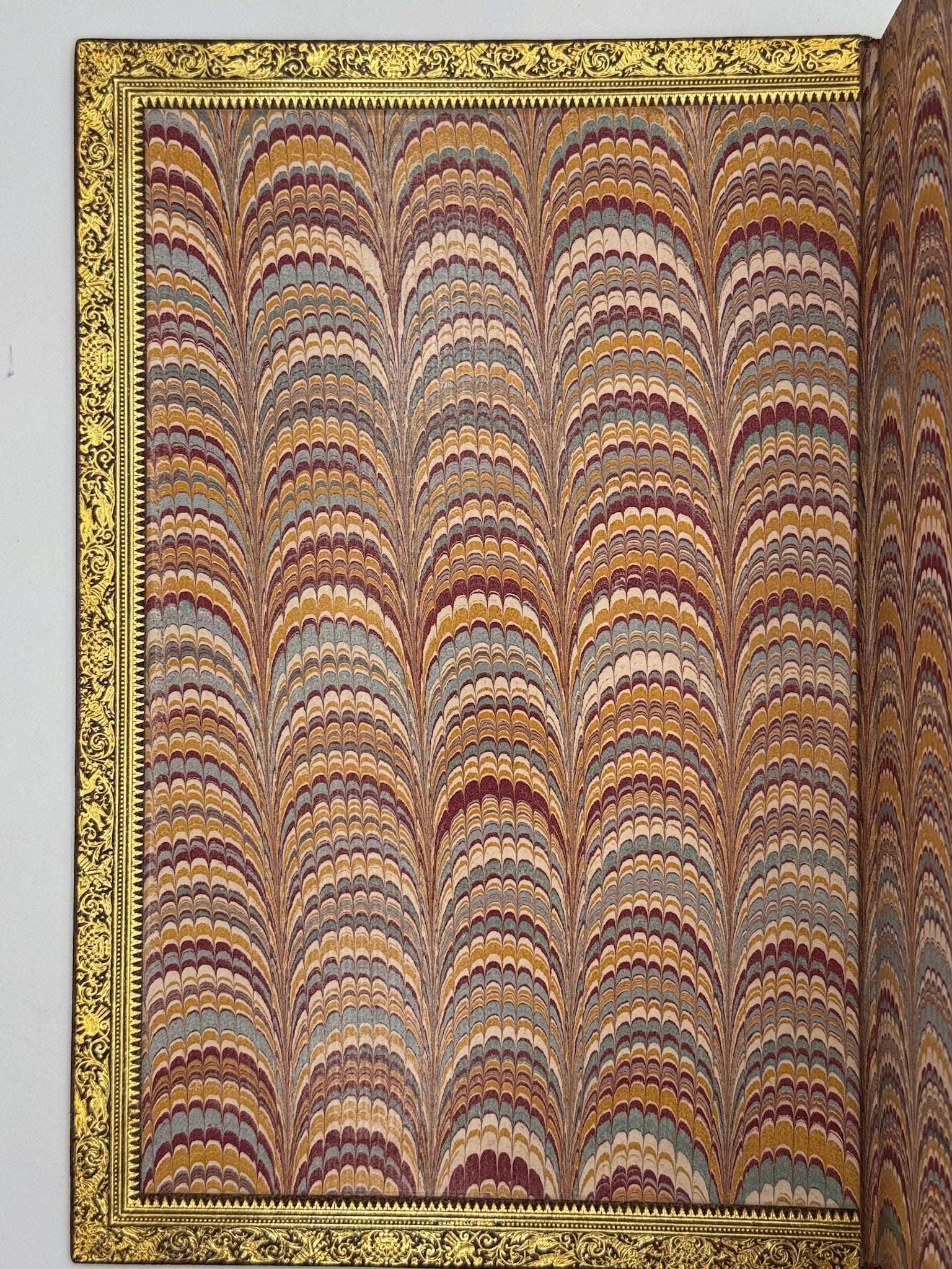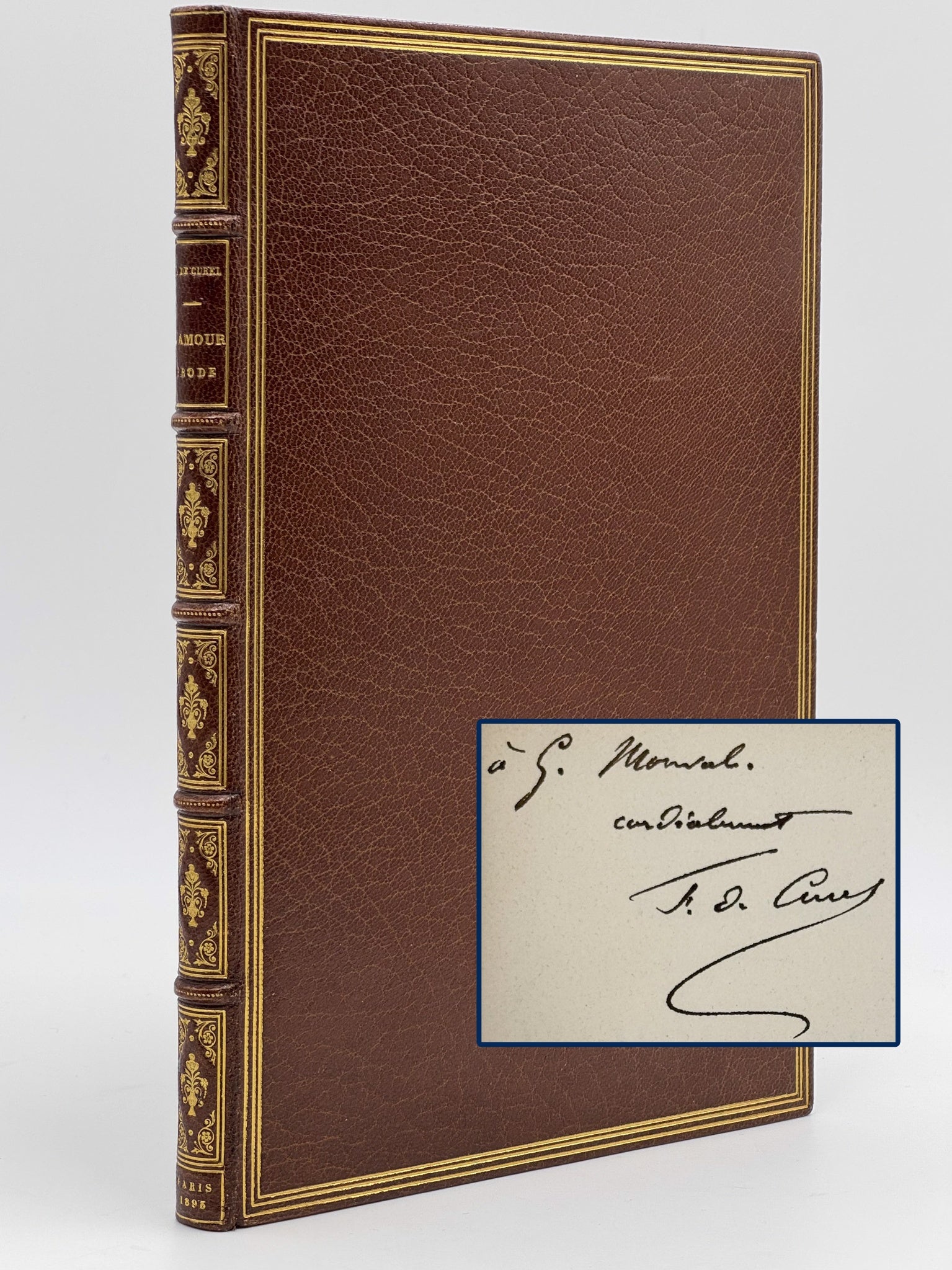 Plein maroquin chocolat, triple filet doré d'encadrement des plats, dos à nerfs richement décoré de caissons à double filet, écoinçons et vase fleuri comme fer central doré, auteur et titre doré, double filet doré sur les coupes, tranches dorées, roulette intérieure (Chambolle-Duru).