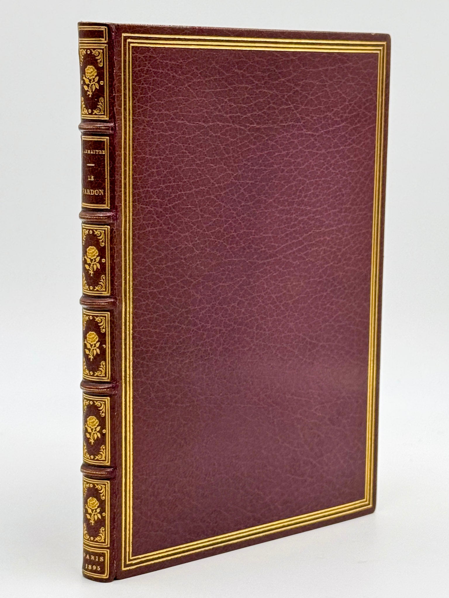 Plein maroquin aubergine, triple filet d'encadrement des plats, dos à nerfs richement orné de caissons à double filets, écoinçons et rose centrale dorée, auteur et titre doré, double filet doré sur les coupes, tranches dorées, roulette intérieure, non rogné (Chambolle-Duru).
