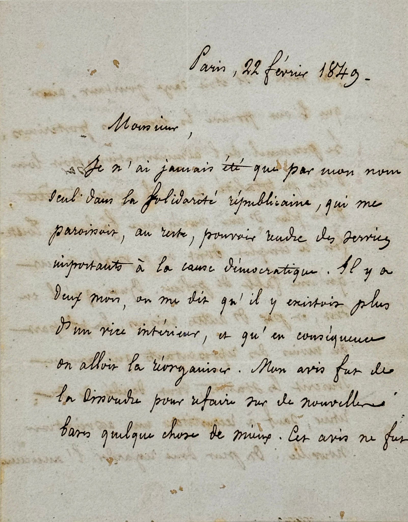 Je n'ai jamais été que par mon nom seul dans la solidarité républicaine, qui me paraissais, au reste, pouvais rendre des services importants à la cause démocratique. Il y a deux mois, on me dis qu'il y existais plus d'un rire intérieur, et qu'en conséquence on allait la réorganiser. Mon avis fus de la Dissoudre pour refaire sur de nouvelles bases quelque chose de mieux. Cet avis ne fut pas suivi. Il était rayé pourtant, aussi que l'ont prouvé les événements postérieurs.