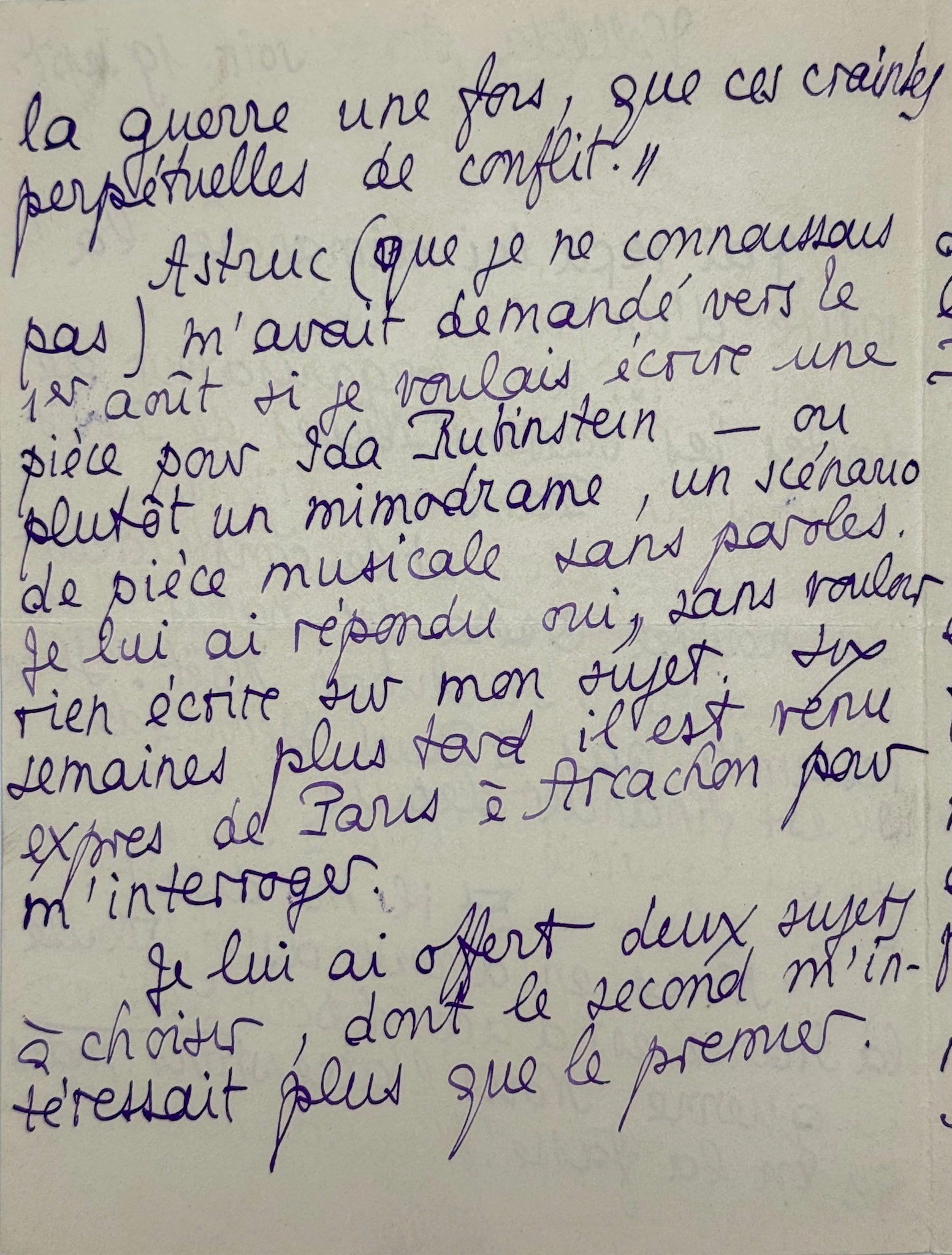 Astruc (que je ne connaissais pas) m'avait demandé vers le 1er août si je voulais écrire une pièce pour Ida Rubinstein - ou plutôt un mimodrame, un scénario de pièce musicale sans paroles. Je lui ai répondu oui, sans vouloir rien écrire sur mon sujet. Deux semaines plus tard il est venu exprès de Paris à Arcachon pour m'interroger.
