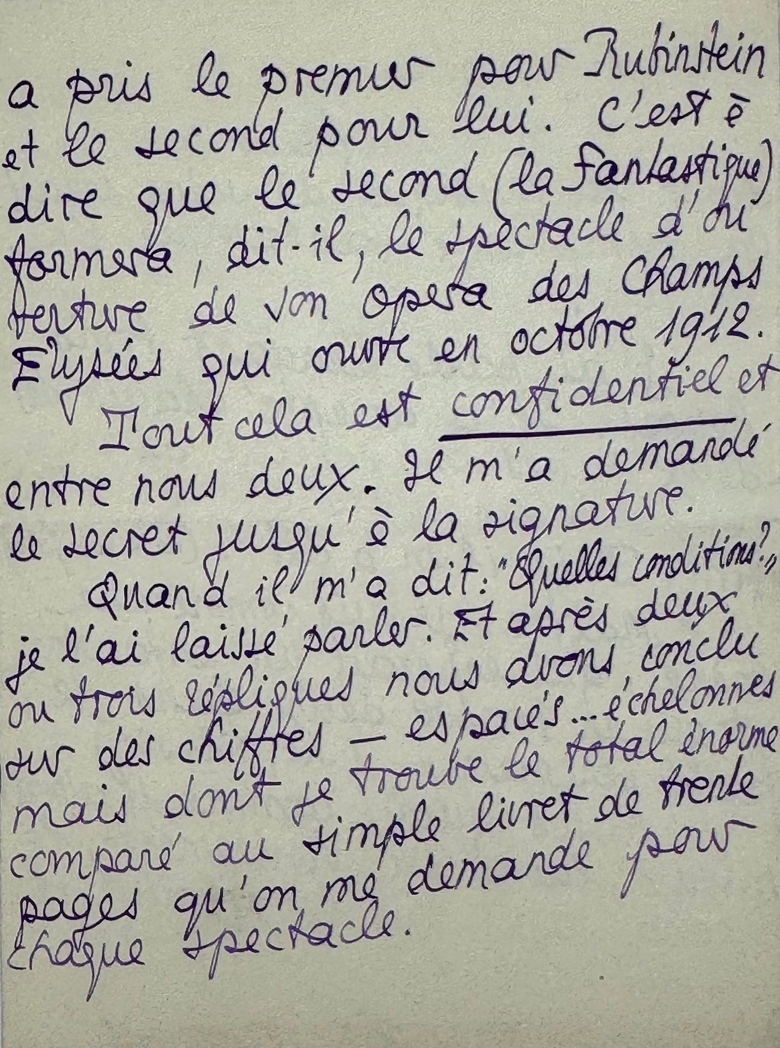 Après quoi, comme il aimait mieux, lui aussi, visiblement, le second sujet que le premier, il a pris le premier pour Rubinstein et le second pour lui. C'est à dire que le second (la Fantastique) formera, dit-il, le spectacle d'ouverture de son opéra des Champs Elysées qui ouvre en octobre 1912.