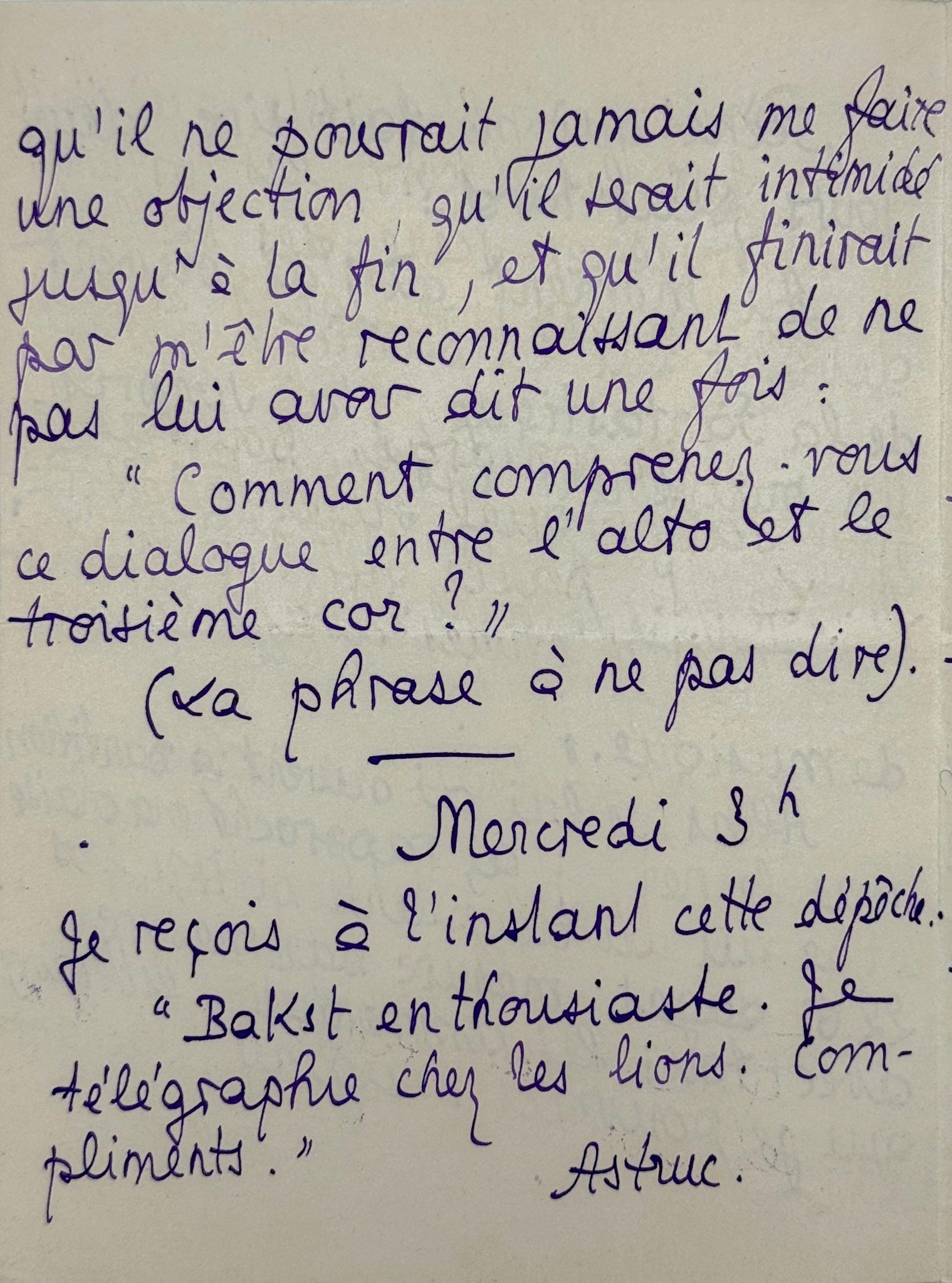 "Bakst enthousiaste. Je télégraphe chez les lions. Compliments."