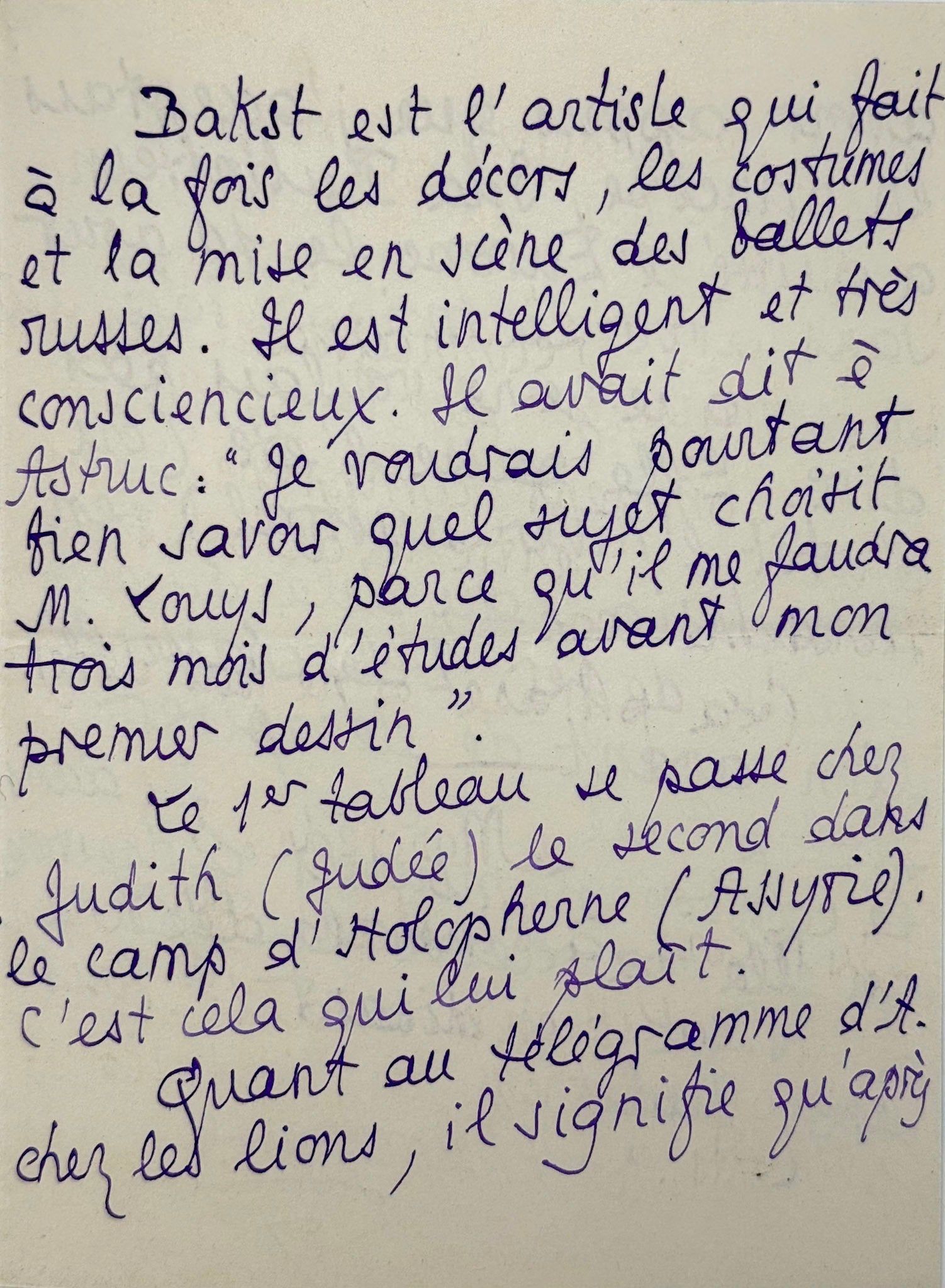 Longue et savoureuse lettre où Louÿs raconte sa rencontre avec Gabriel Astruc, les projets de mimodrames pour Ida Rubinstein et l'Opéra des Champs-Elysées, ainsi que les coulisses enthousiastes des Ballets russes.