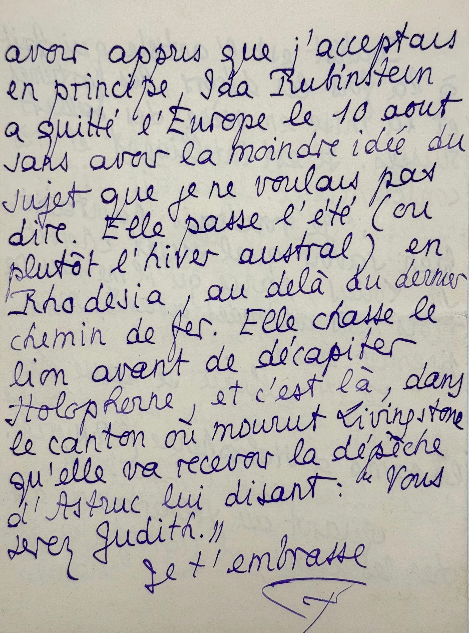 Quant au télégramme d'A chez les lions, il signifie qu'après avoir appris que j'acceptais en principe, Ida Rubinstein a quitté l'Europe le 10 aout sans avoir la moindre idée du sujet que je ne voulais pas dire. Elle passe l'été (ou plutôt l'hiver austral) en Rhodesia, au delà du dernier chemin de fer. Elle chasse le lion avant de décapiter Holopherne, et c'est là, dans le canton où mourrut Livingstone qu'elle va recevoir la dépêche d'Astruc lui disant : "Vous serez Judith".