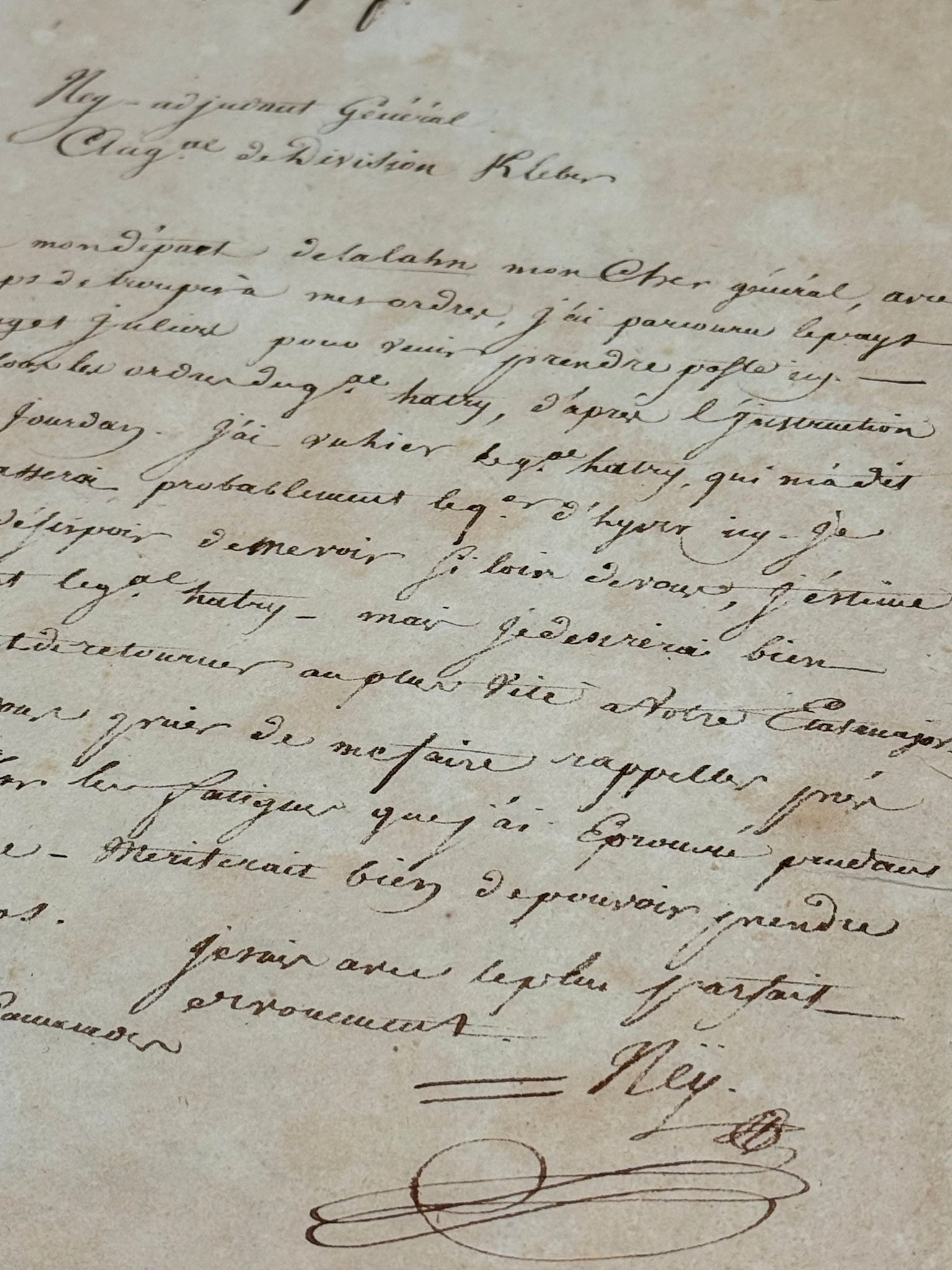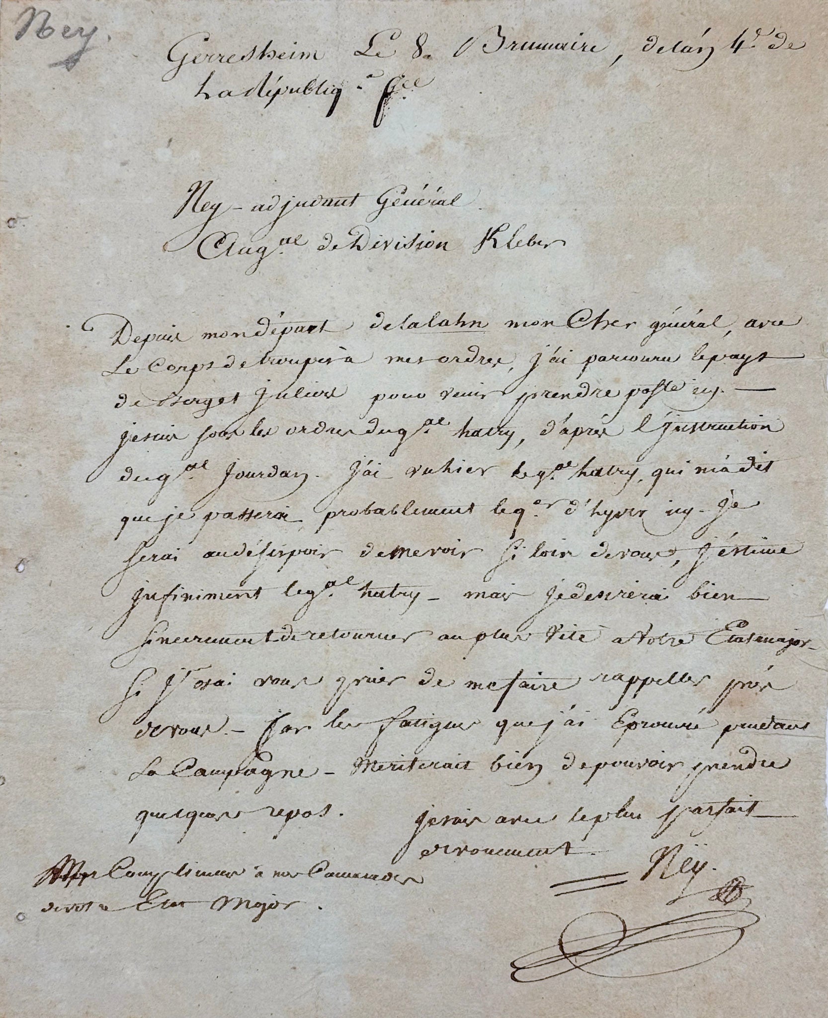 Belle lettre de celui qui fut nommé le "Brave des braves" à Kléber, dont il exprime son attachement alors qu'il se trouve sous le commandement du général Hatry.