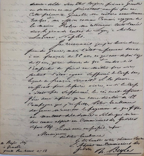 2° De m'accorder un congé afin que dorénavant je puisse toucher cette demi-solde sans être toujours présent à Grenoble, ou du moins en me présentant une fois par an. Cette présence à Grenoble me coûtera annuellement 3 ou 400 francs; mes affaires comme commis-voyageur de la maison Robert me retiennent toute l'année sur les grandes routes de Lyon à Milan, Livourne, Naples.