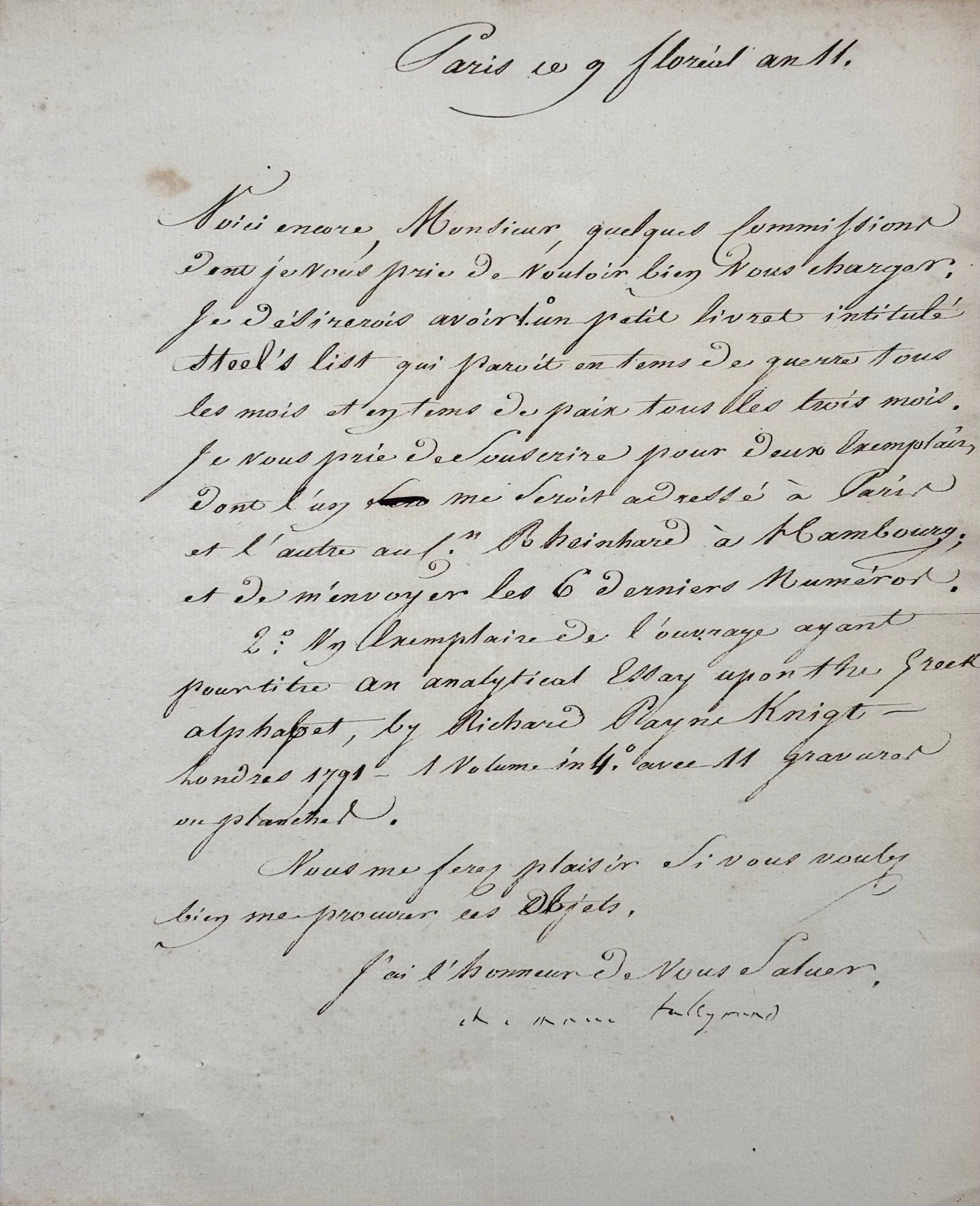 Voici encore, Monsieur, quelques commissions dont je vous prie de vouloir bien vous charger : je désirerais avoir 1. un petit livret intitulé stool's list qui parait en tems de guerre tous les mois et en tems de paix tous les trois mois. Je vous prie de souscrire pour deux exemplaires dont l'un me serait adressé à Paris et l'autre au citoyen Reinhard à Hambourg et de m'envoyer les 6 derniers numéros.