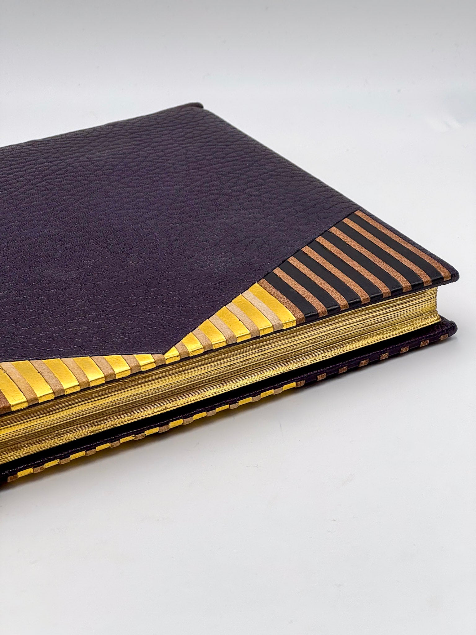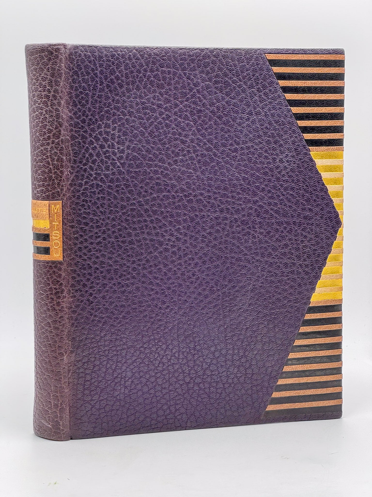 Plein maroquin prune, plats décorés de mosaïques de bandes de maroquin marron alternant sur fond de papier doré, pièce de titre sur le dos, tranches dorées sur témoins, doublé de maroquin prune avec dans chaque plat une gravure sur soie encastrée, gardes de satin prune, étui (A. Poulduian).