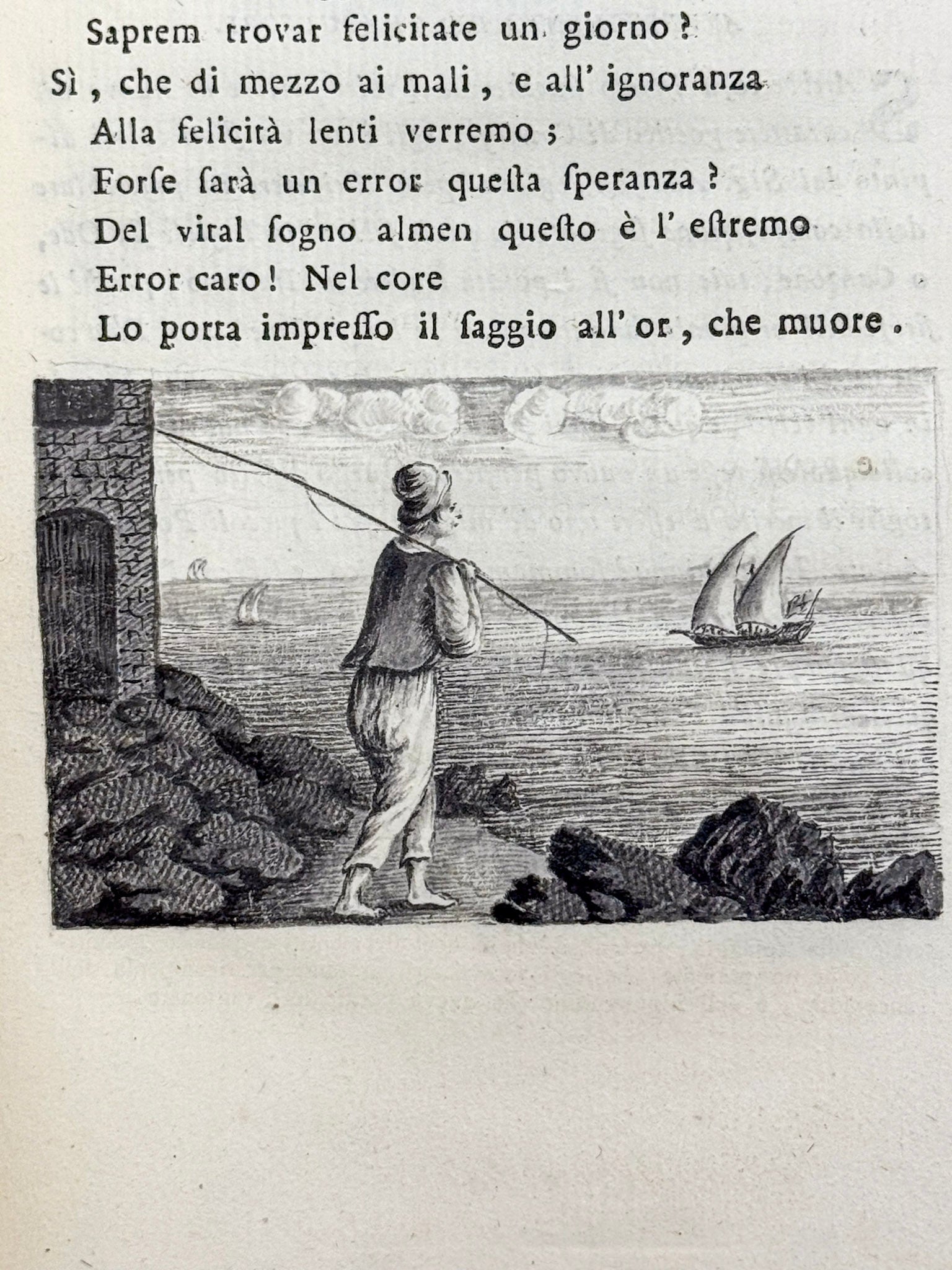Précieux exemplaire enrichi de 5 dessins originaux exécutés à l'encre noir et au lavis gris : au frontispice, puis aux pages 6, 31, 41 et 73. Le frontispice reprenant les armoiries de la vignette de la page de titre - à savoir, celles de la famille Giustiniani de Gênes. Le suivant représente un bateau amarré près des côtes. Le troisième représente un pêcheur se dirigeant vers la mer. Le quatrième représente la vue d'une ville et, enfin, le dernier représente un bateau retournant à un port.